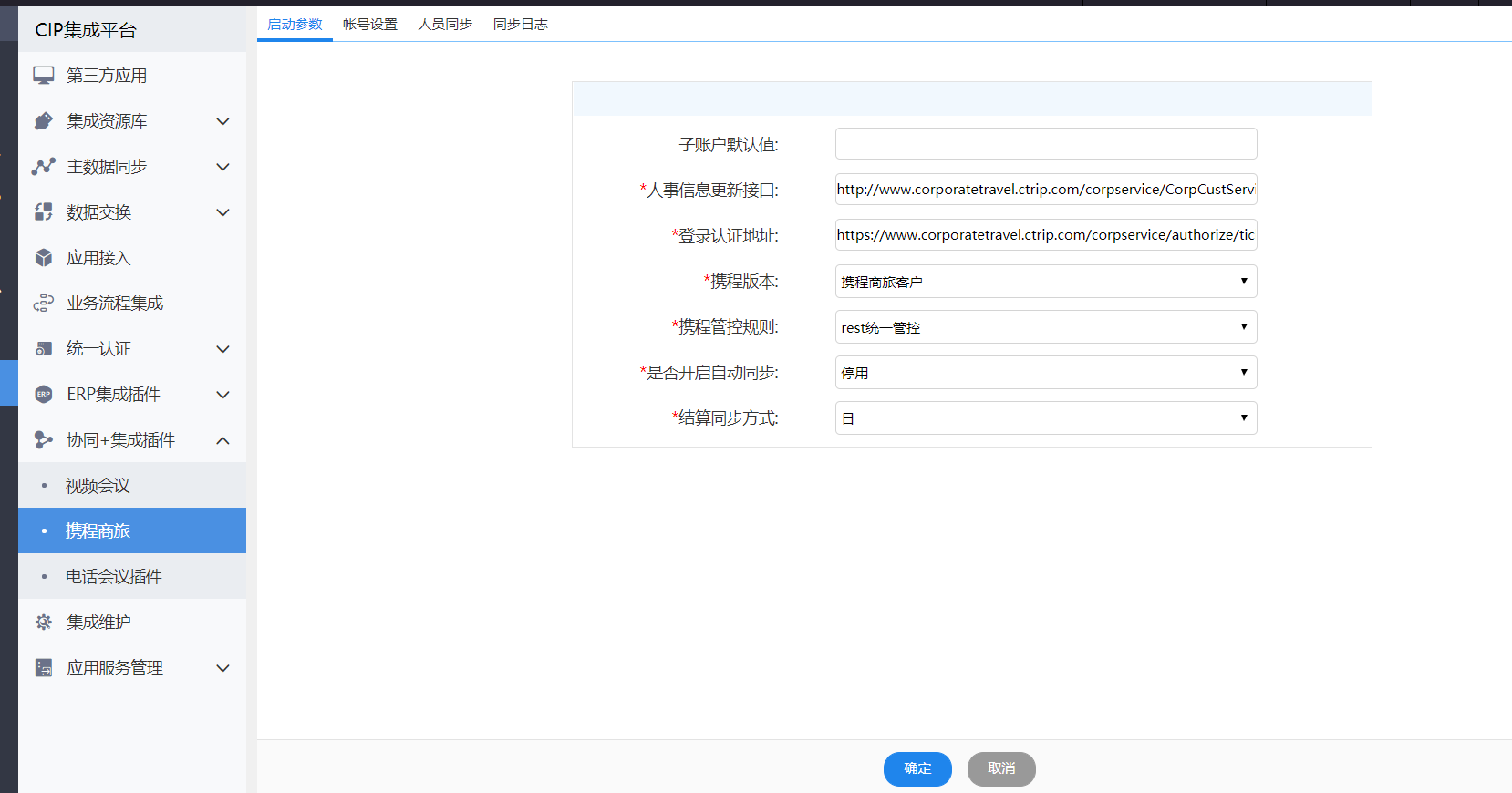 打开OA,登录集团管理员(集团版)或企业管理员(企业版),进入CIP平台-》协同+集成插件-》携程商旅-》启动参数页签,见图参数配置说明: