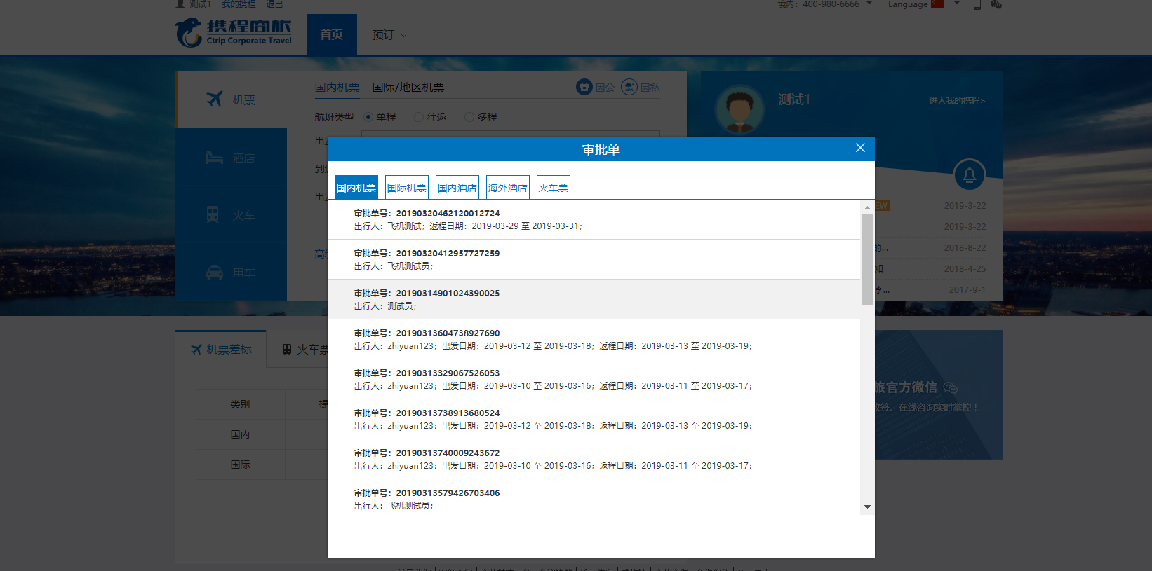 3)、出差申请单中有携程审批和携程订票节点,领导审批通过后会自动生成OA审批单,将订票信息及规则传给携程。