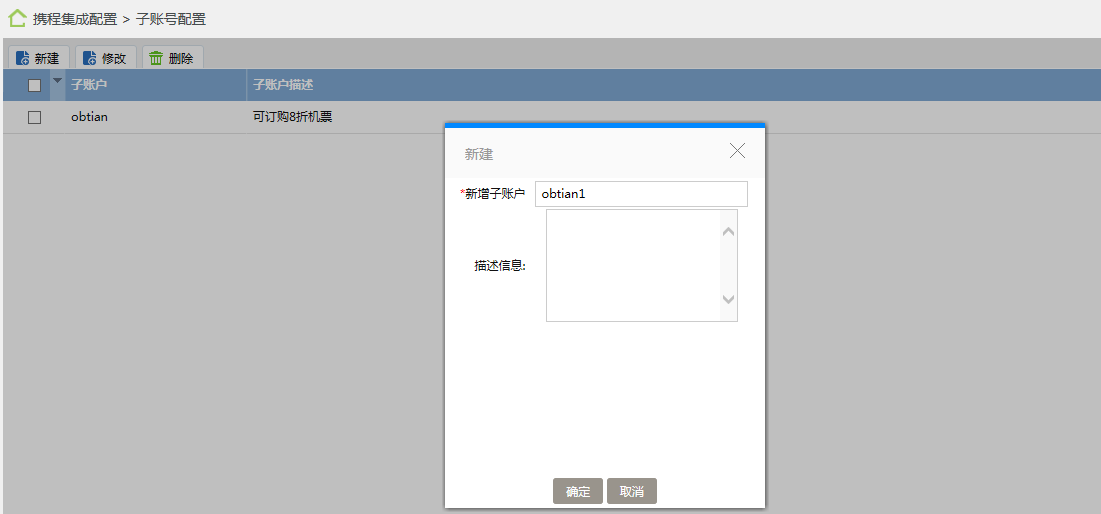 在携程集成配置中点击子账号户菜单,可以进行子账号的新建、修改及删除操作。如下图所示: