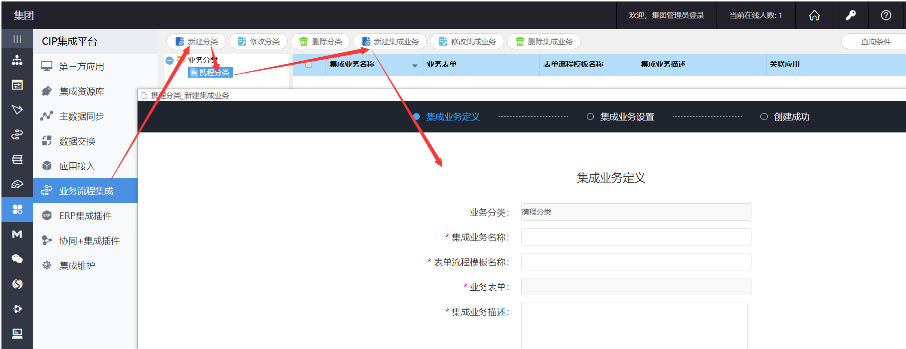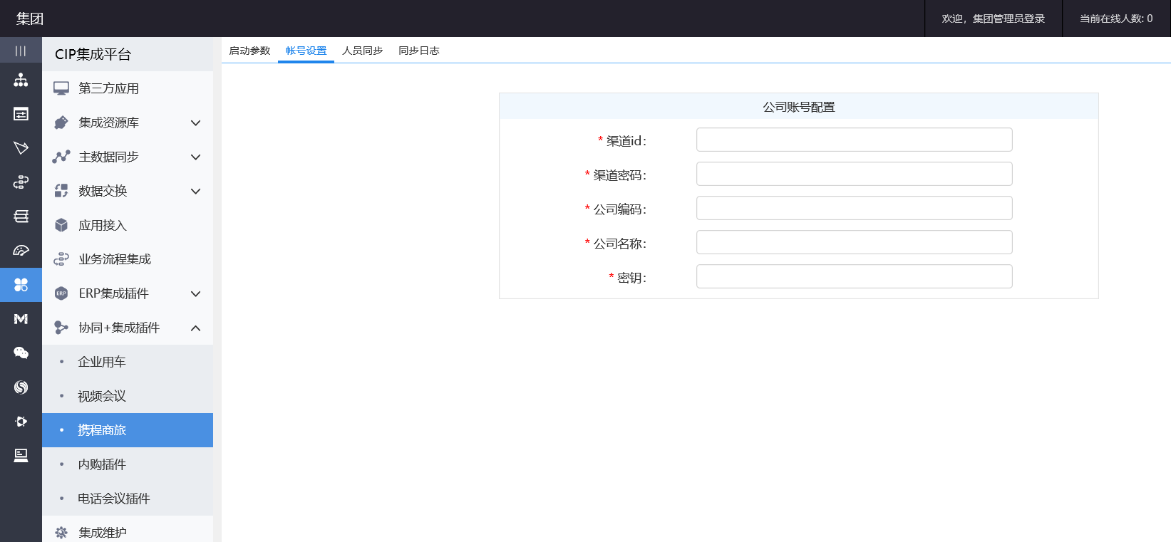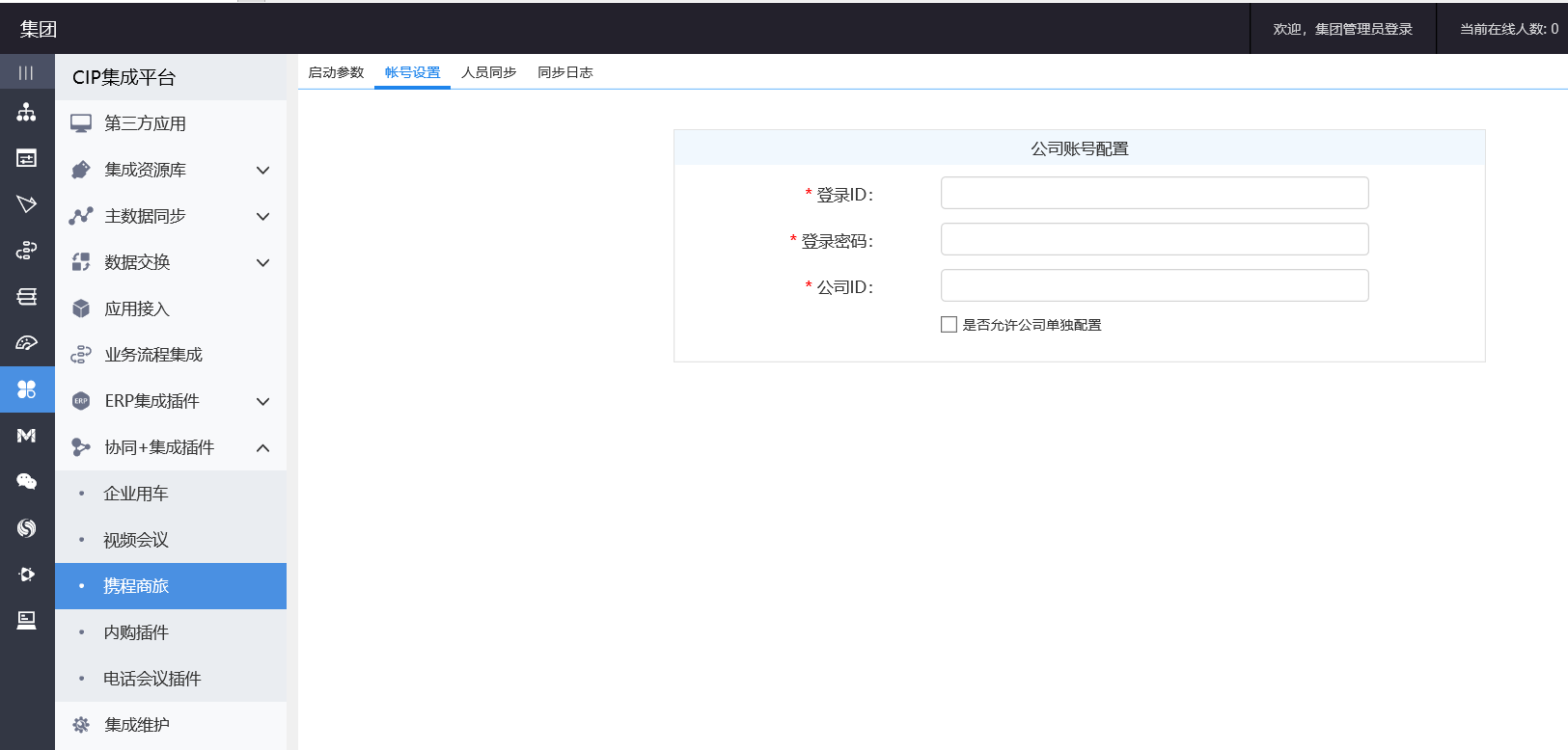 当配置好携程集成插件相关参数后,集团管理员登录可以看到菜单:携程集成配置,如下图所示: