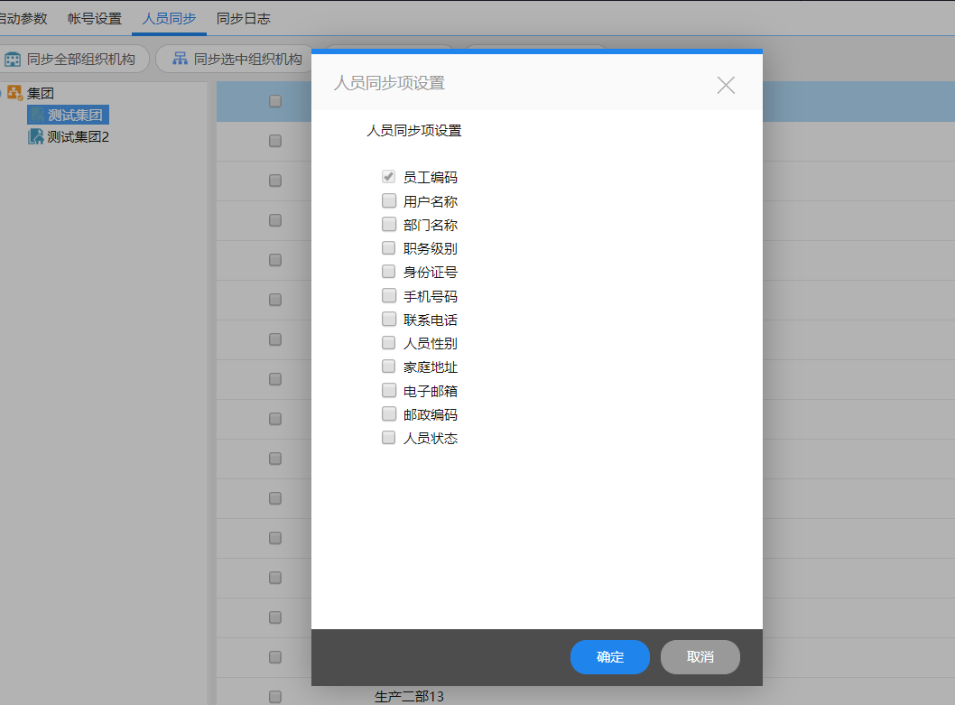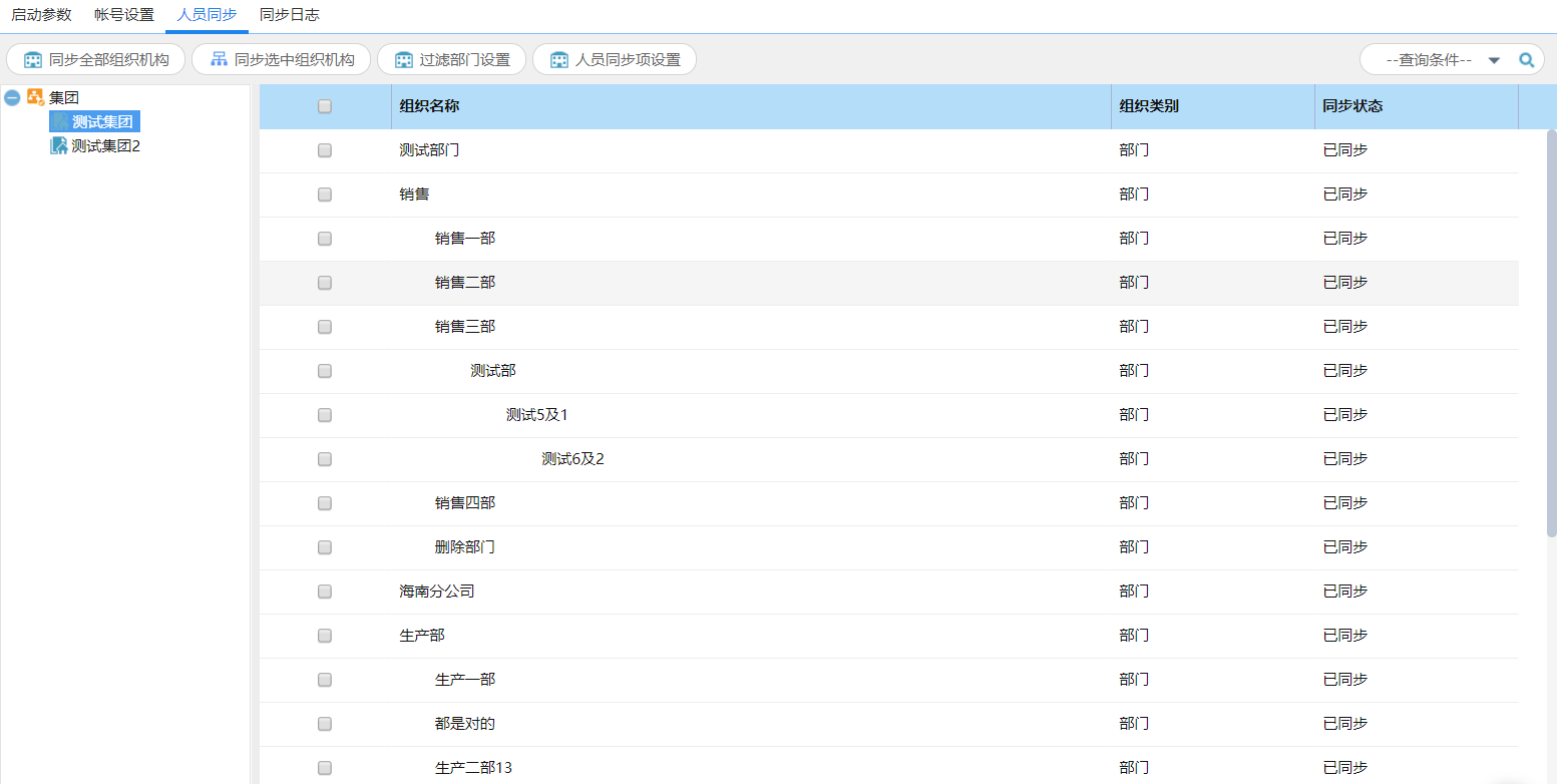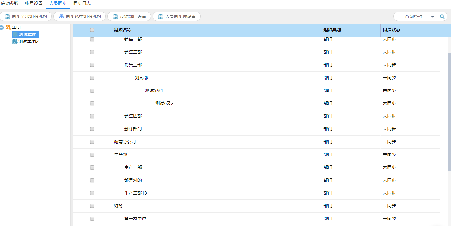 【人员信息同步】页面进行A8人员信息同步至携程的操作,支持同步全部组织机构,也支持同步部分组织机构。左侧树选中"集团",右侧按级次展示集团下的所有单位;选中具体的单位,右侧按照级次展示该单位下所有的部门,如下图所示: