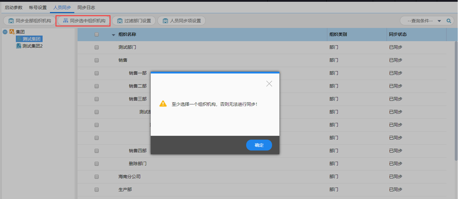 勾选要开通携程账号的单位或部门,点击"同步选中组织机构"按钮可以选择单位或单位下的部门进行同步