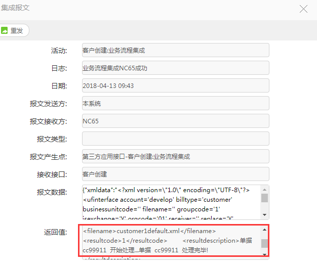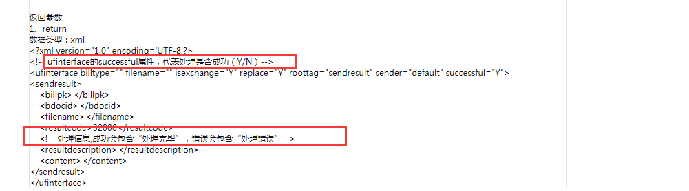 在返回值:单据处理信息,如果单据处理失败,则会提示错误信息,成功则提示单据处理完毕;