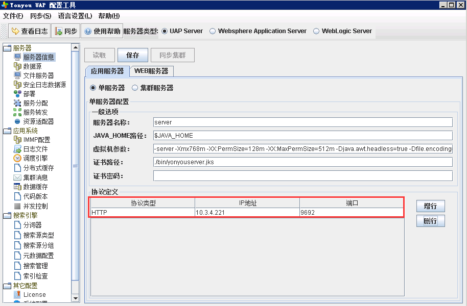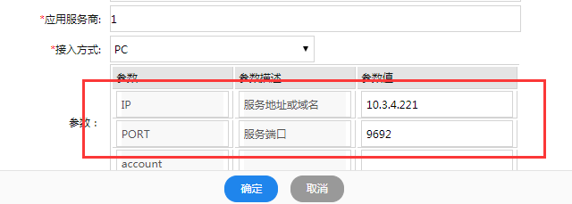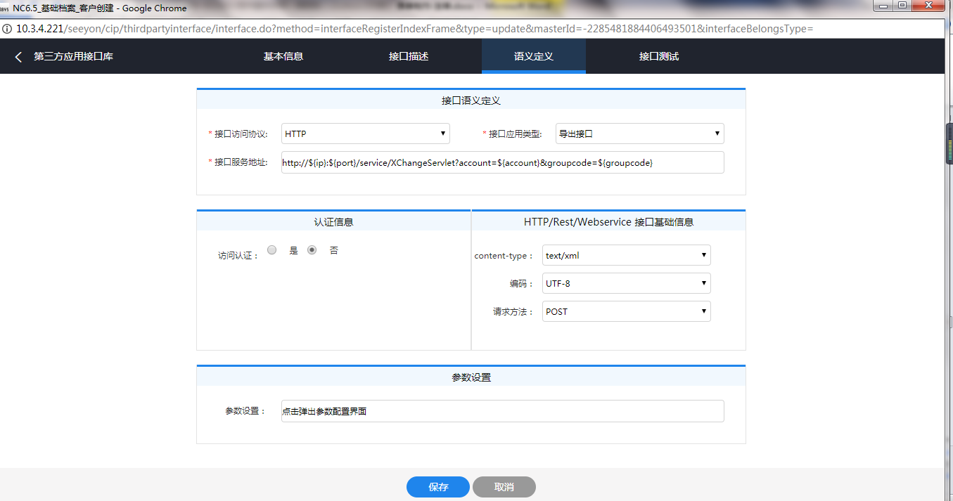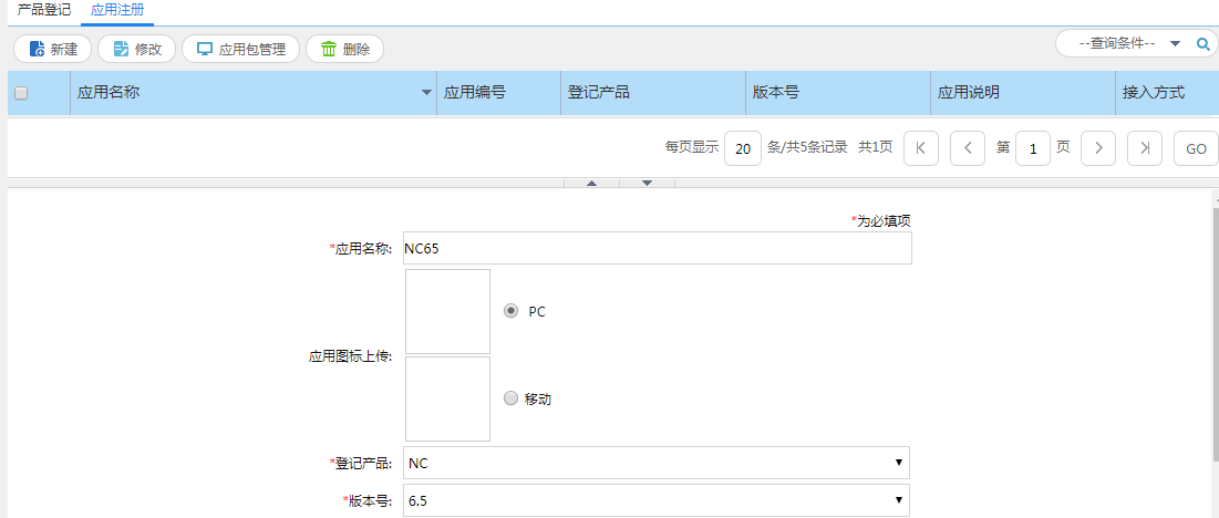 输入应用名称、选择登记产品为NC(这里的NC为产品登记处的NC)、设置参数(ip,port),点击保存,完成外部系统的注册;