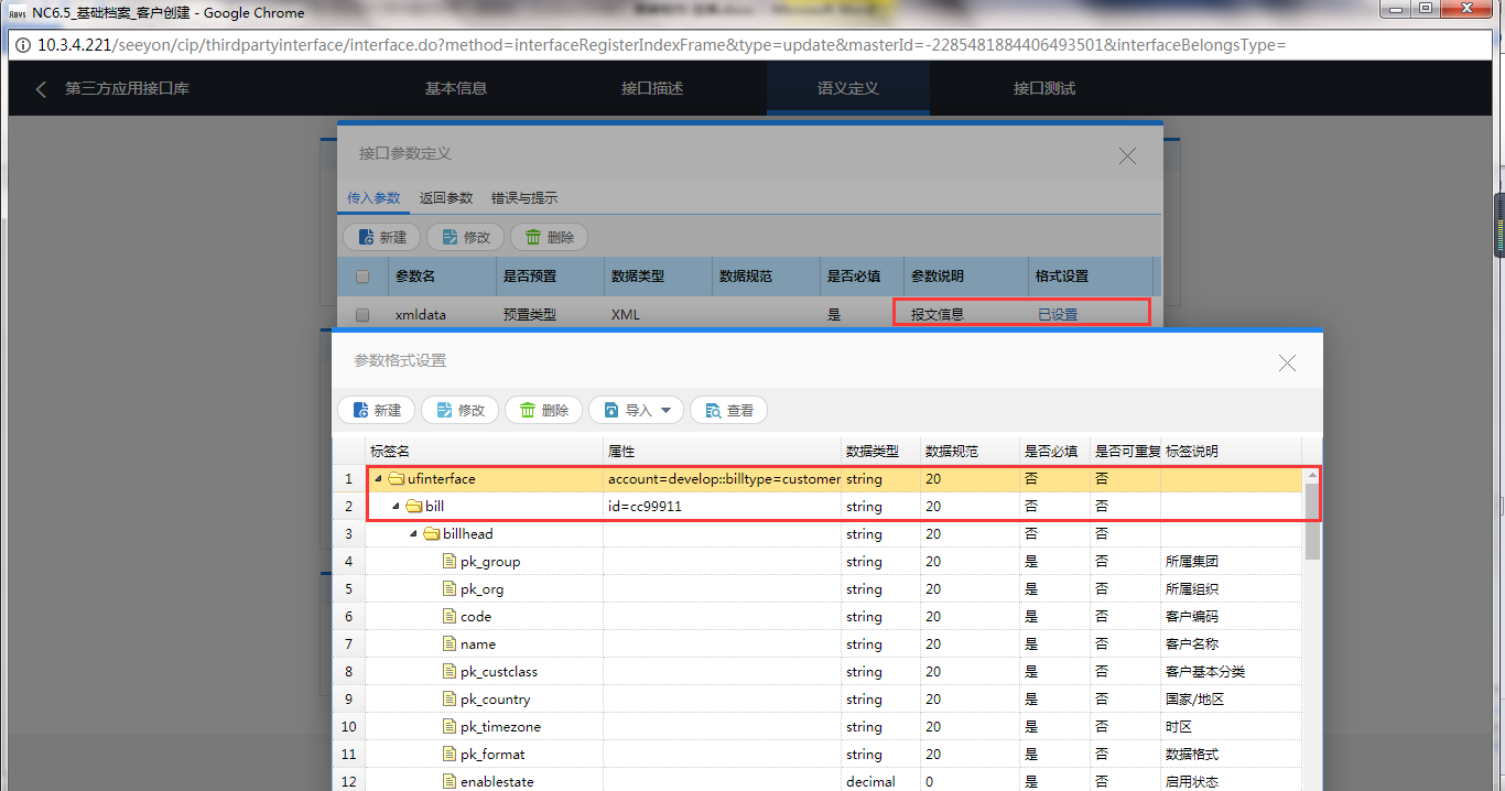 如上图,点击设置弹出参数格式设置,这里需要对第一行的ufinterface与第二行的bill的id进行设置;
