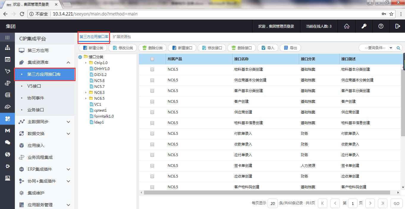 - 选择CIP集成平台-集成接口-外部接口库(管理所有的第三方系统所开放的接口)