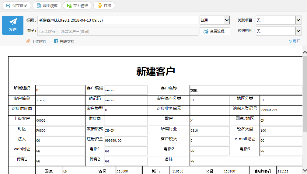 以上步骤完成后即完成客户创建单据的制作,下面测试单据;业务场景就是OA发单,NC获取数据的过程;