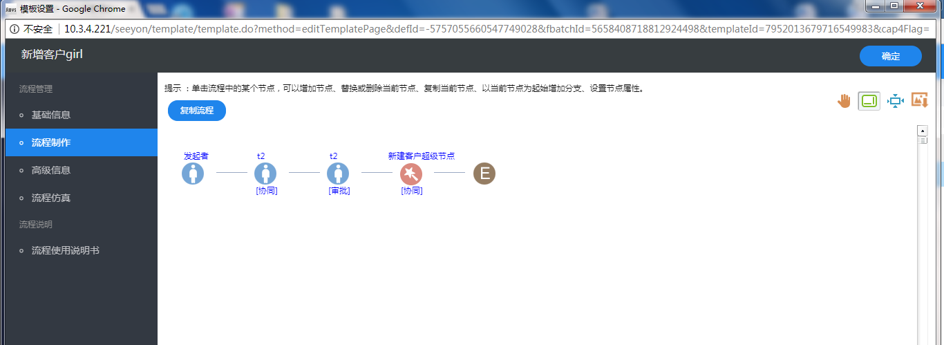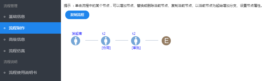 此处显示流程图就是表单流程制作中的流程图,我们这里需要在最后一个节点后面增加超级节点;
