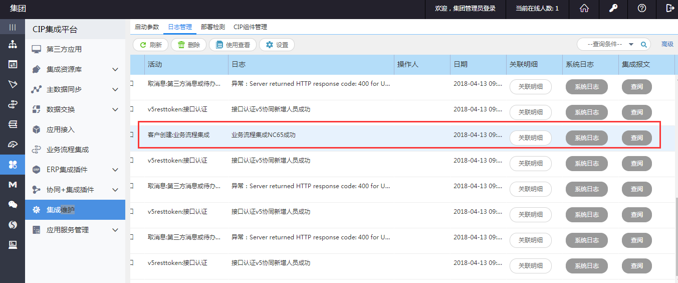 选择CIP集成平台-集成维护-日志管理-选择客户创建-点击查阅-