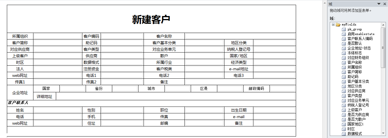 右侧myfields为NC数据库表中所有字段映射,包含表单显示项,表单隐藏项;此处设置的目的是:业务流程配置超级节点进行表单与NC客户表中字段绑定映射