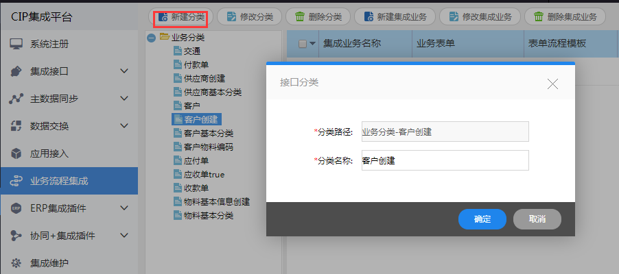 - 点击新建分类,创建业务分类:用于区分业务属于哪个外部系统;