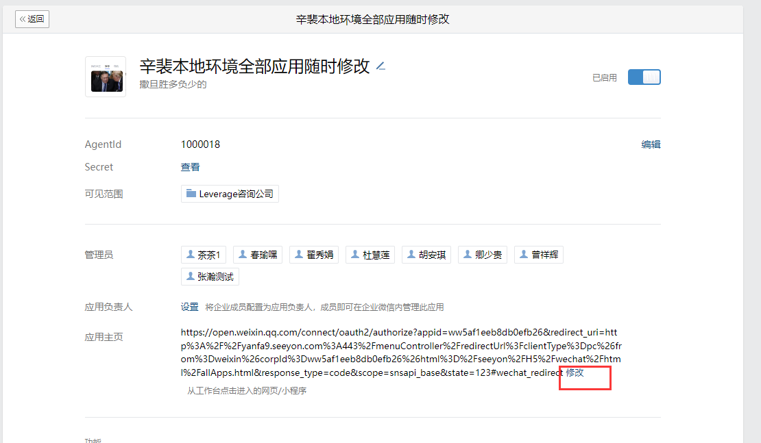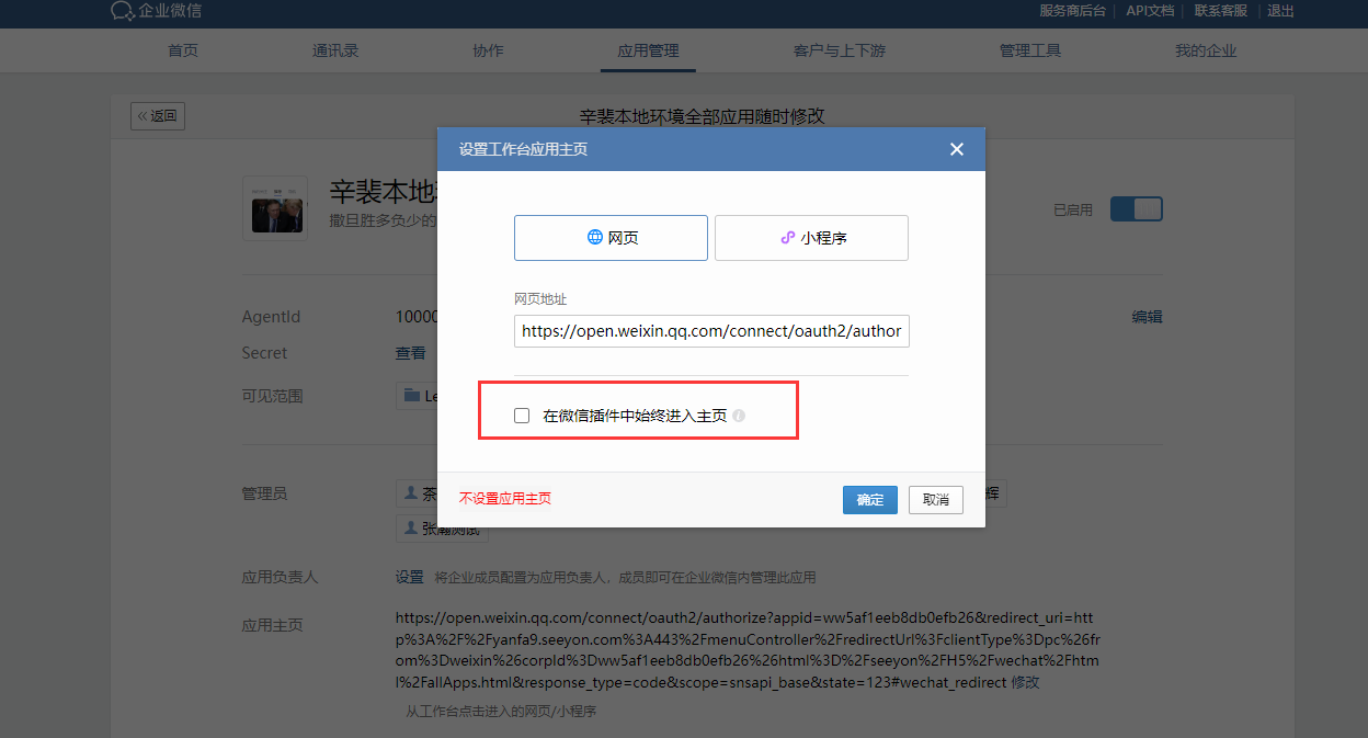 调整对应配置:企业微信开放平台打开对应应用,应用主页选择修改,在修改界面勾选在微信插件中始终进入主页