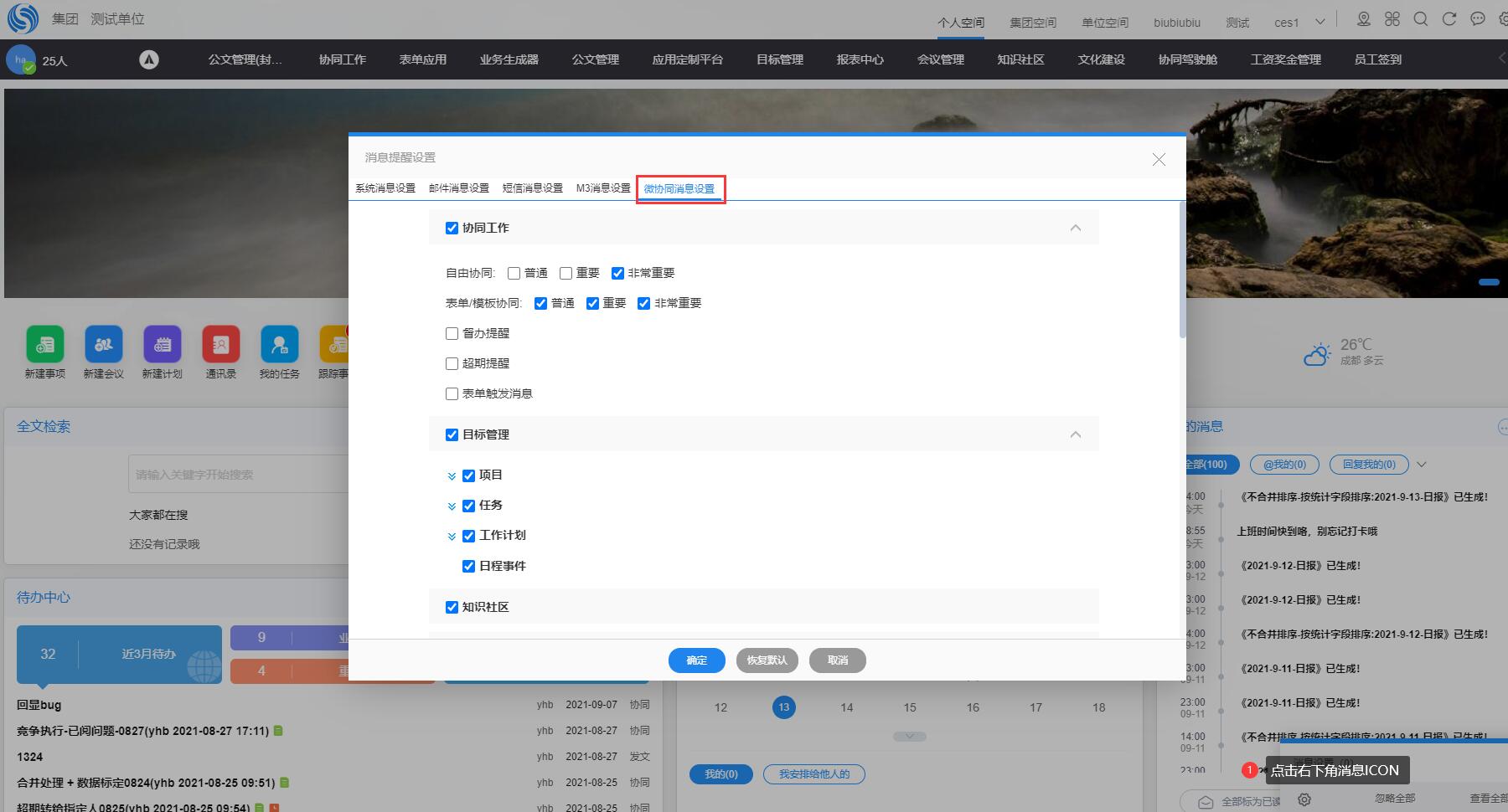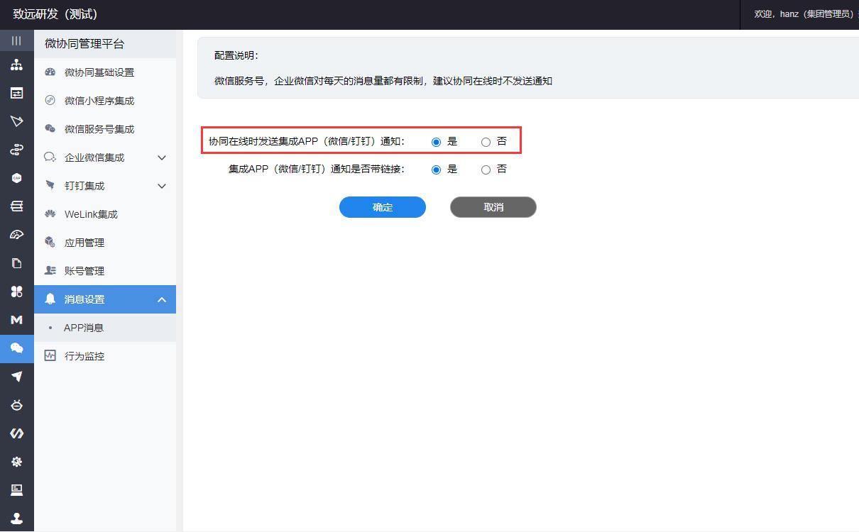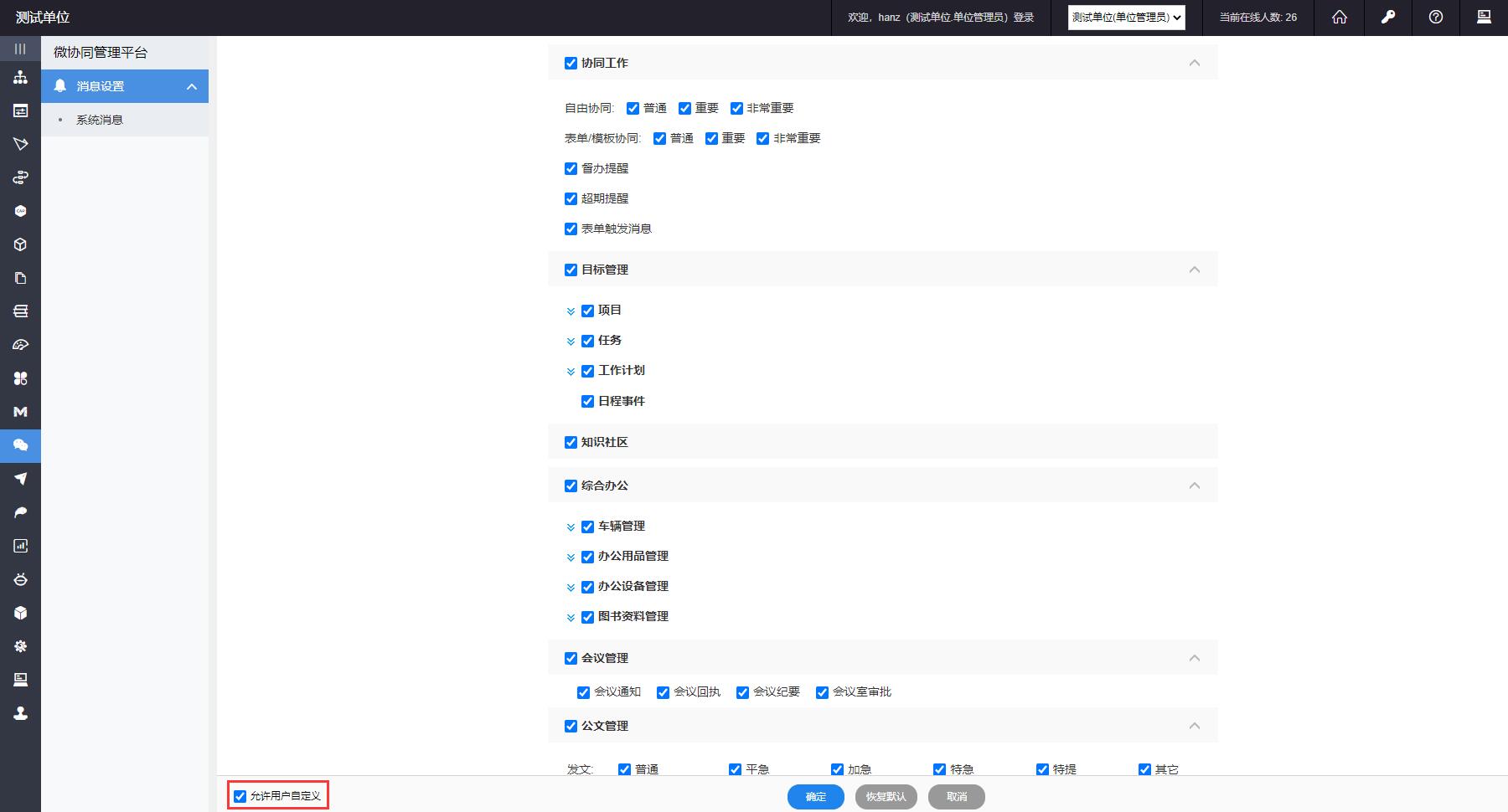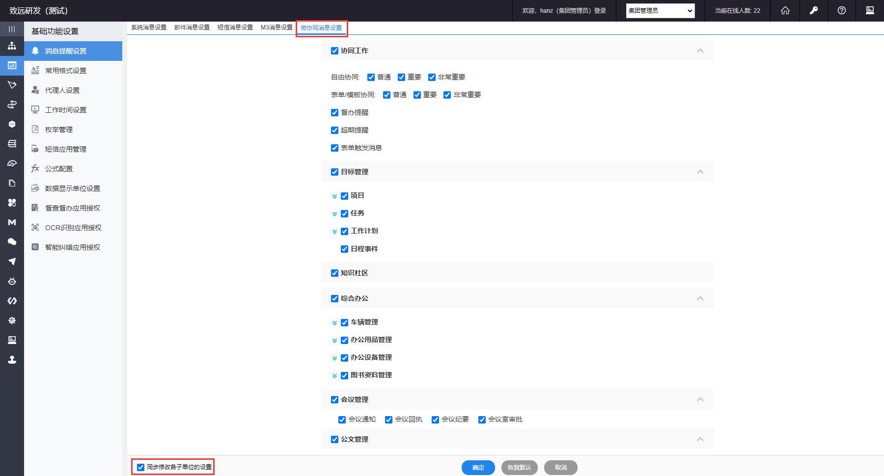 注意左下角配置项:集团消息配置是否能更改单位消息配置