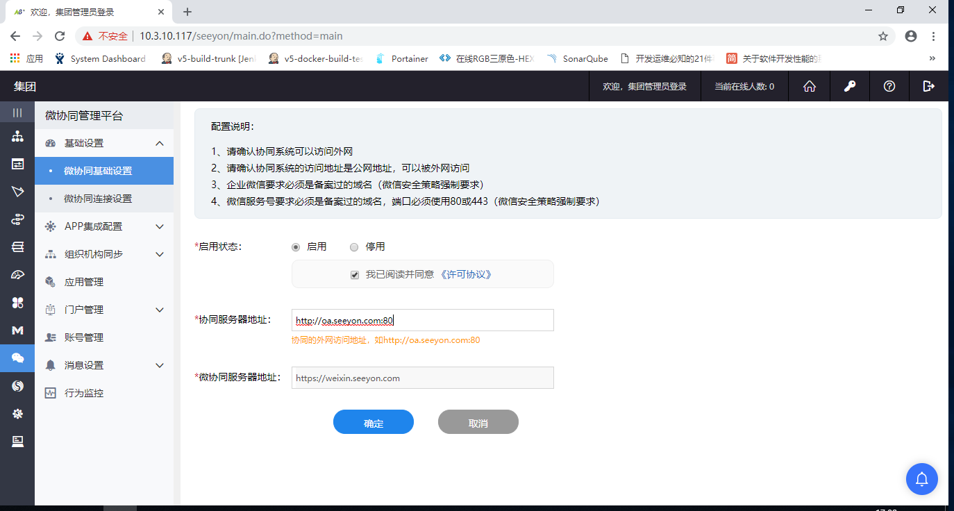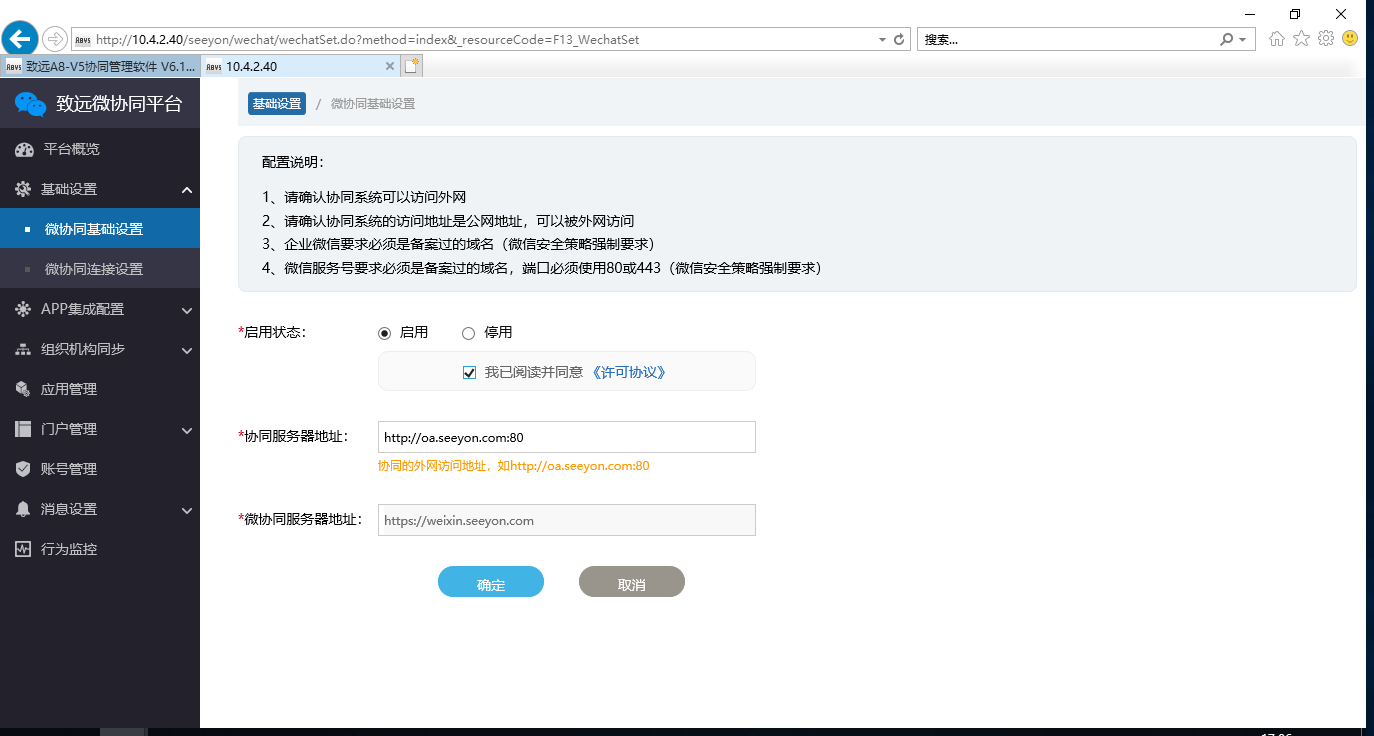 1、填充相关参数后,点击确定按钮,提示成功后即可,如果不成功,可以先排查OA地址外网是否可以访问;如有内网环境与外网环境映射,请确保OA能够访问微协同(可以OA服务器通过curl -I https://weixin.seeyon.com看是否成功,如果是unknownhost,则在OA服务器上多次ping weixin.seeyon.com该域名,不同地区会返回不同ip地址,请以实时测试返回的ip地址为准,配置host文件);还需要确保微协同环境能够访问OA环境,请在OA访问策略配置白名单(微协同服务器出口ip:59.110.227.61)。