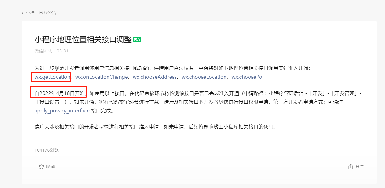 从2022.4.18日起,小程序版本的发布审核需要配置获取位置接口权限,不然审核会失败。