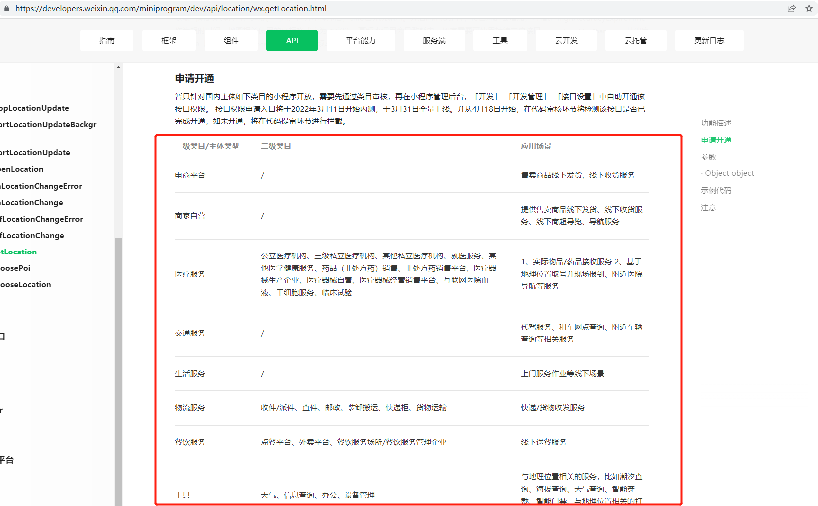 1.首先进入小程序获取当前地理位置接口,找到申请开通项,找到符合当前小程序的类目。小程序获取当前地理位置接口地址为:https://developers.weixin.qq.com/miniprogram/dev/api/location/wx.getLocation.html (opens new window)