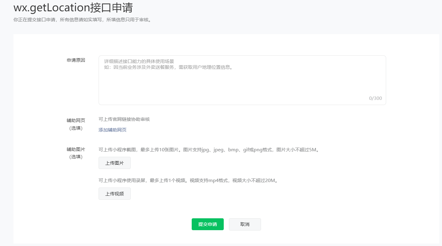 注:申请原因可以多写一点,可以介绍小程序的功能点等等,最后突出需要获取地理位置信息的原因(比如说员工打卡需要获取地理位置)。写少了会申请不过。辅助图片可以截图小程序的操作页面。