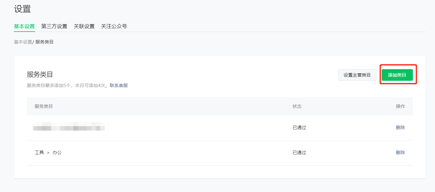 2.进入小程序后台管理新增类目,类目包含当前地理位置接口申请开通项的内容。如果当前小程序的类目已经有了当前地理位置接口申请开通项的内容,则可不用再次添加了。