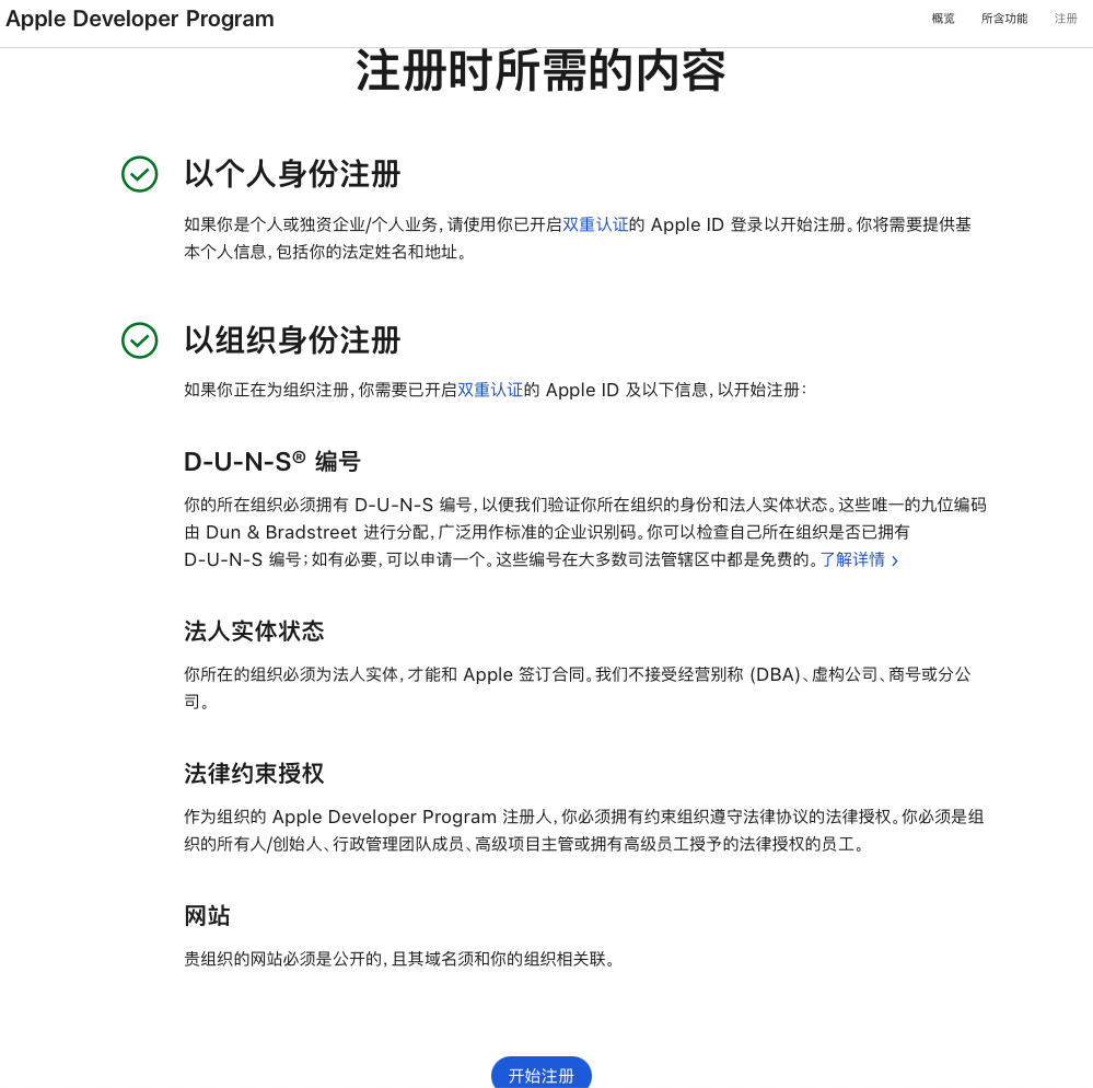 注册Apple ID:https://appleid.apple.com/account 账号管理操作文档:https://developer.apple.com/cn/help/account/ 开发者账号注册:https://developer.apple.com/cn/programs/enroll/ ABM苹果商务账号注册:https://business.apple.com/#enrollment 【Apple 商务管理使用手册:https://support.apple.com/zh-cn/guide/apple-business-manager/axm402206497/web】