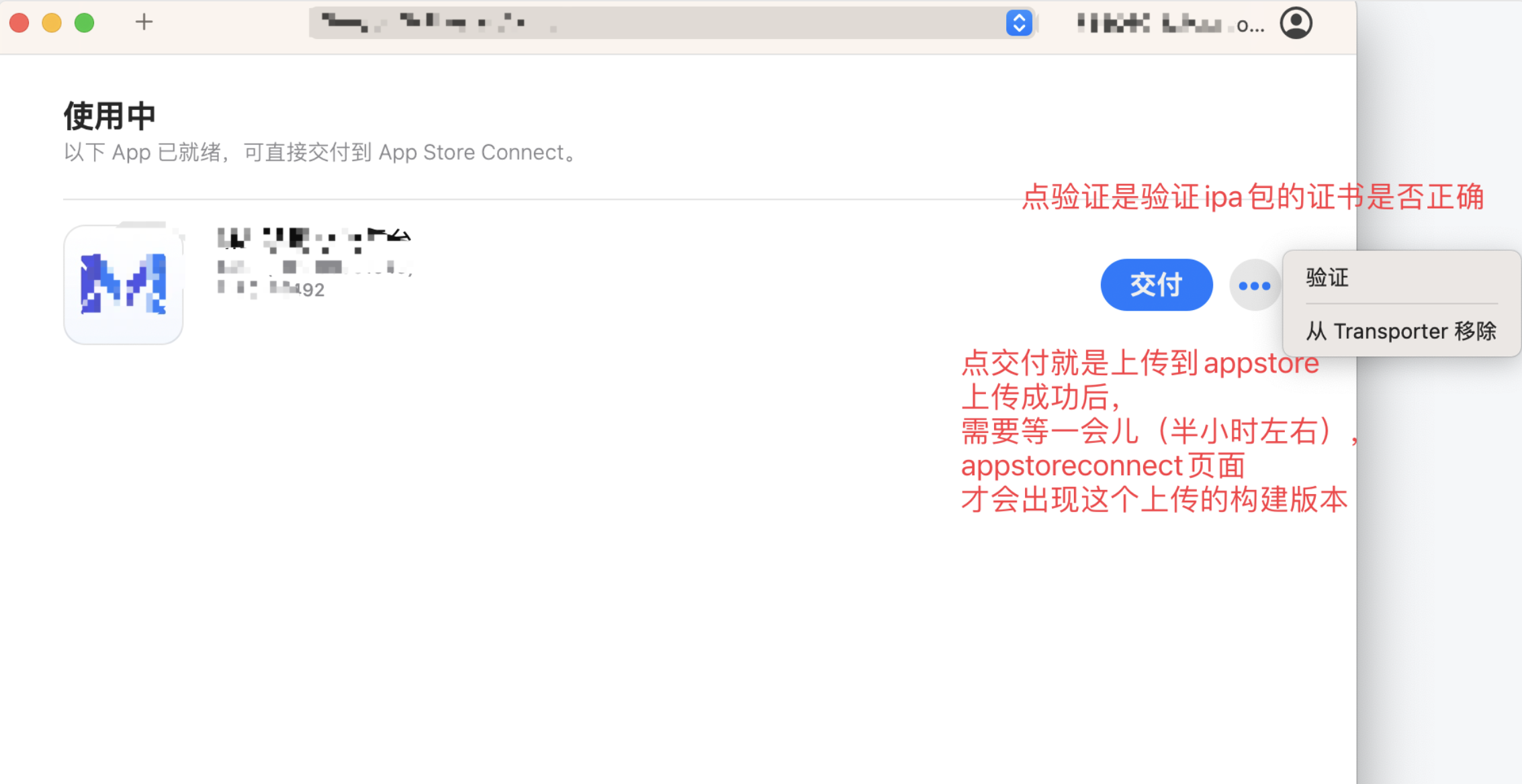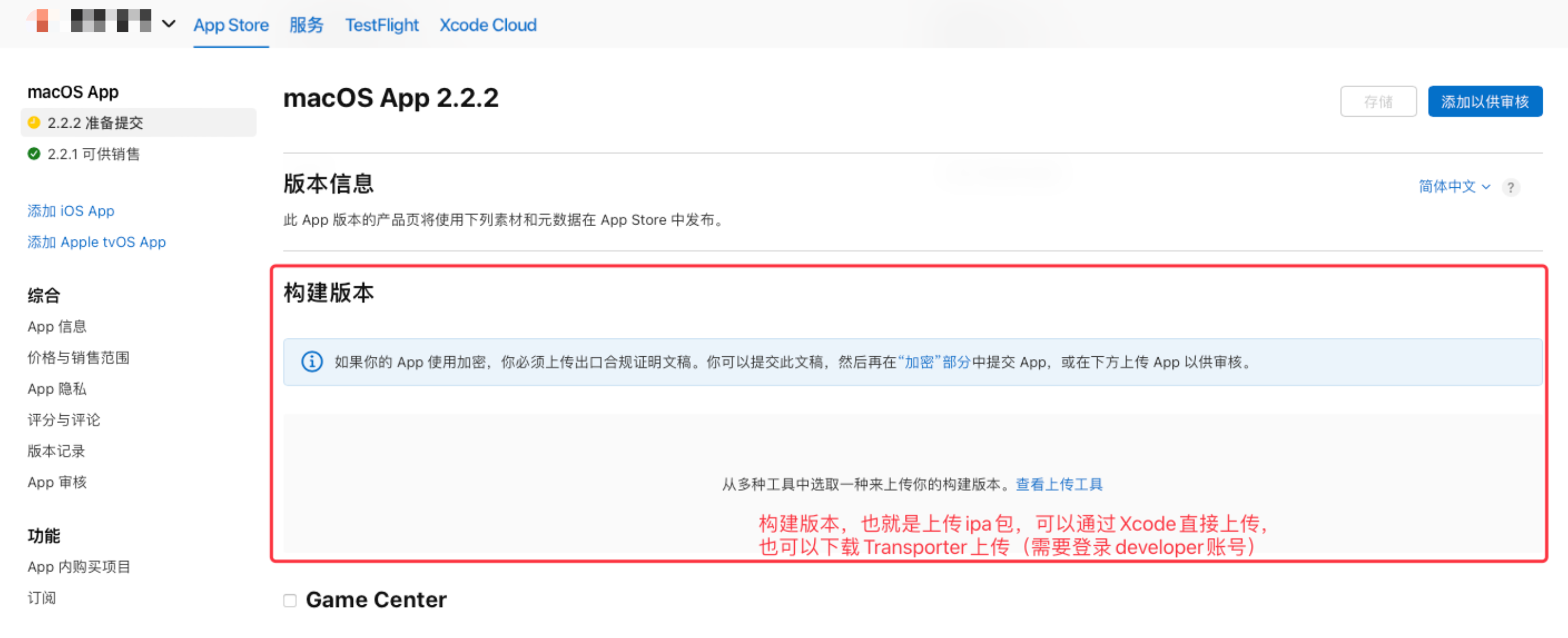 创建好app信息版本号后,可以通过苹果官方app:Transporter上传包,也可以使用Xcode打包后上传。