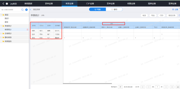 统计报表 =》可以设置行表头、列表头作为统计项统计如图二