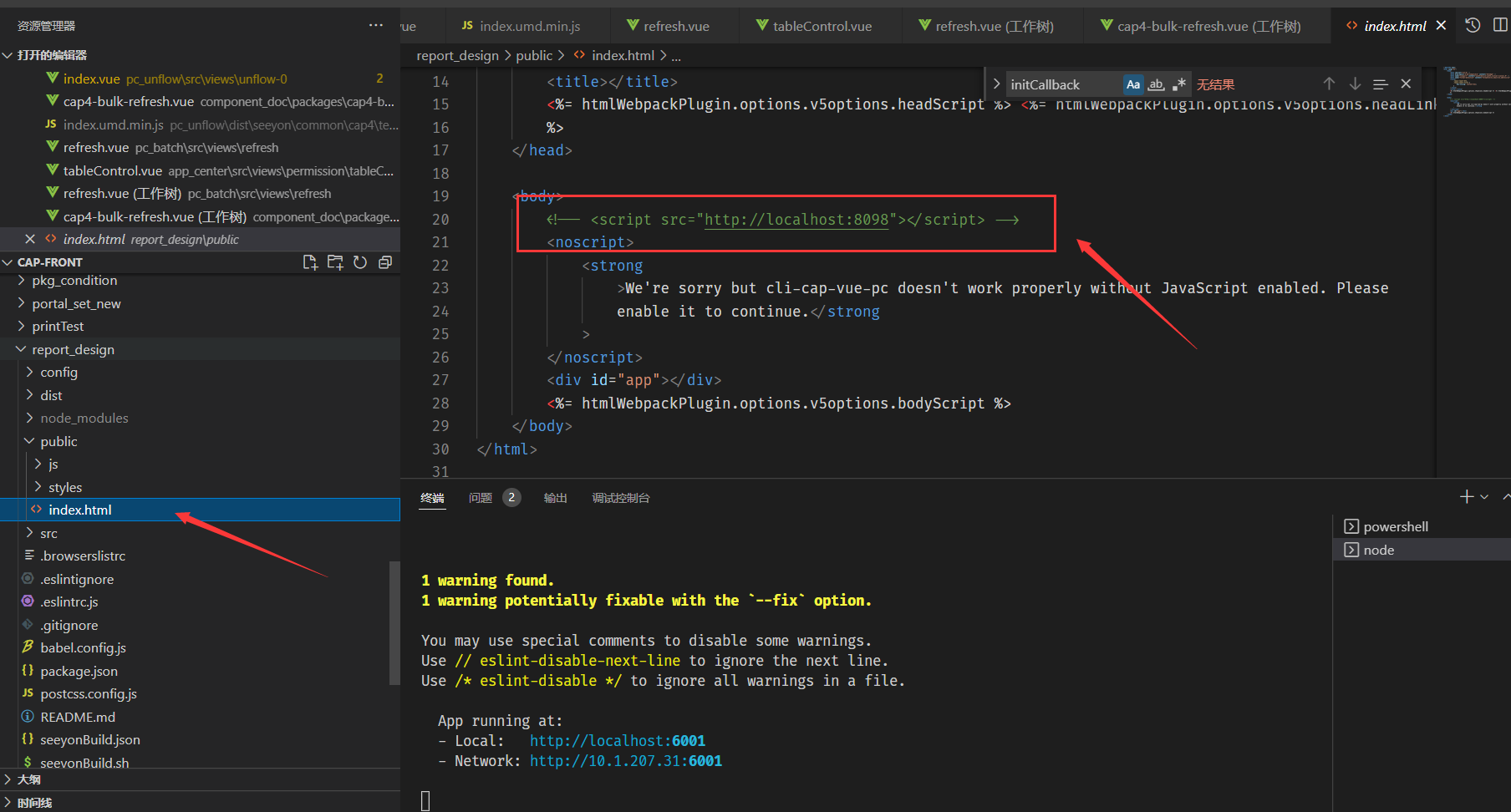 首先启动我们项目npm run serve:你的模板名称