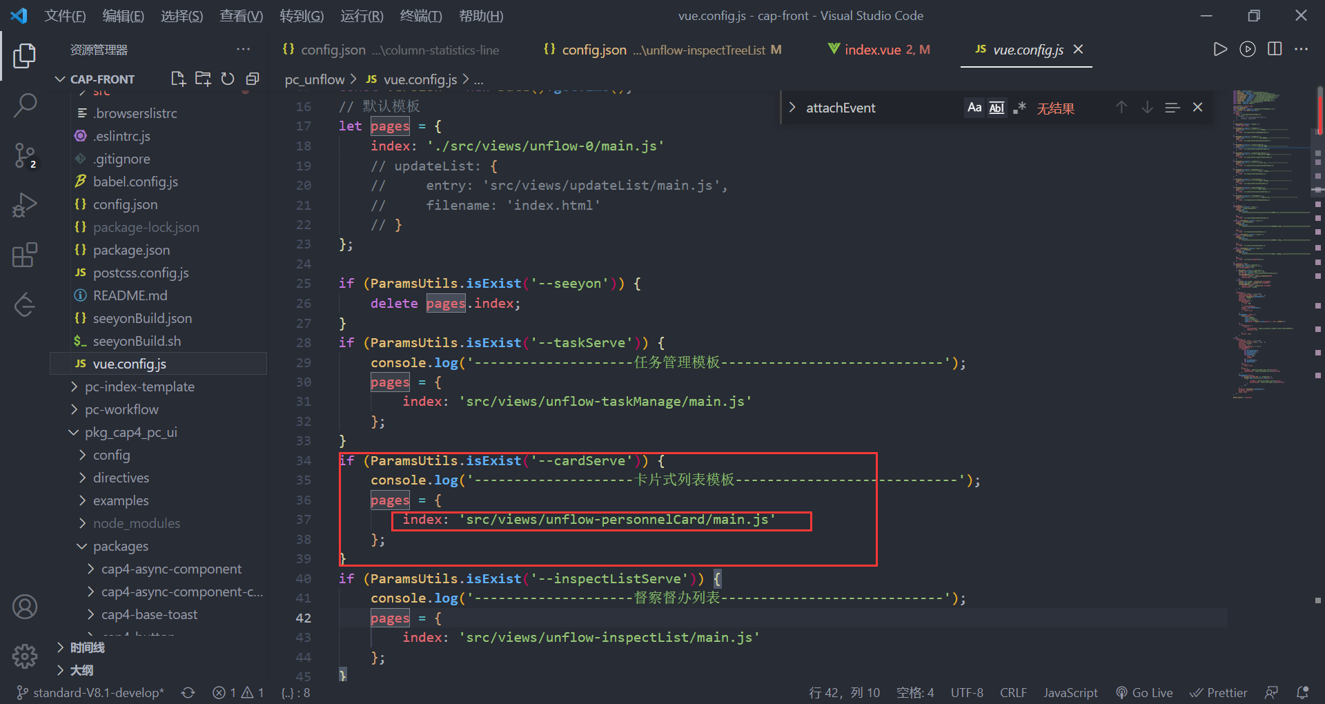 在vue.config.js中添加我们新的模板对应的命令,将红框部分复制一份换成我们新模板对应的打包命令名称以及文件路径即可。