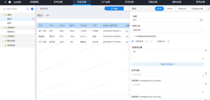 报表分类:查询、单表统计、多表统计、静态报表,每种报表可以自定义数据源、标题、排序、穿透、数据字段等