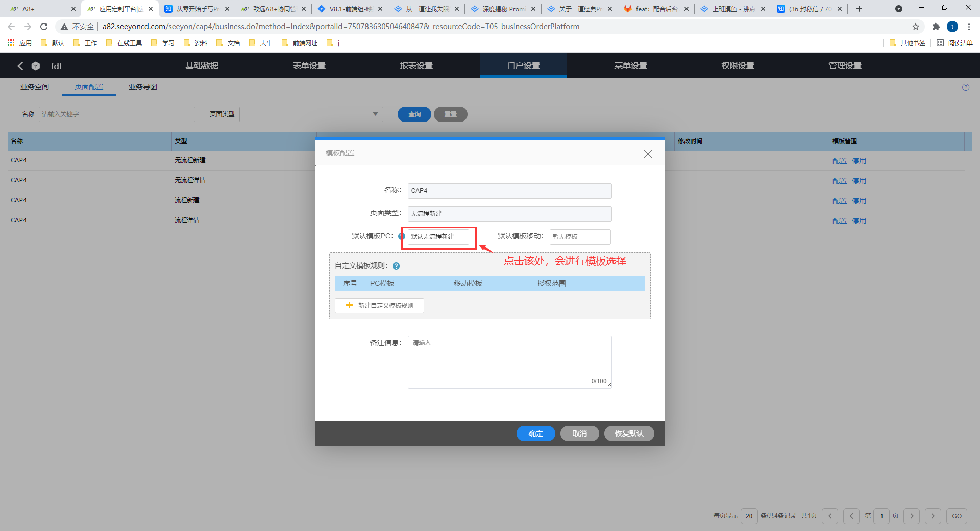 在弹框中点击默认模板PC