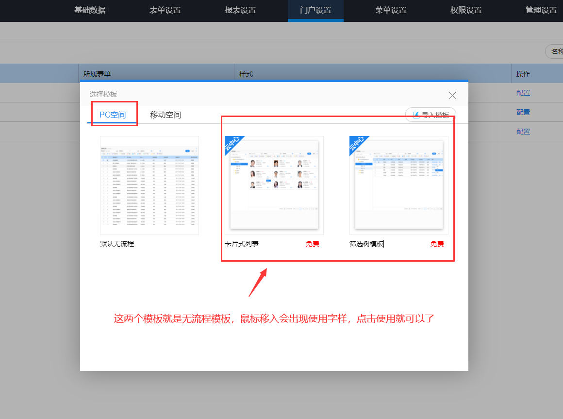 在pc Tab中就是模板,红色框就是无流程的两个模板,鼠标移入,点击使用就可以了
