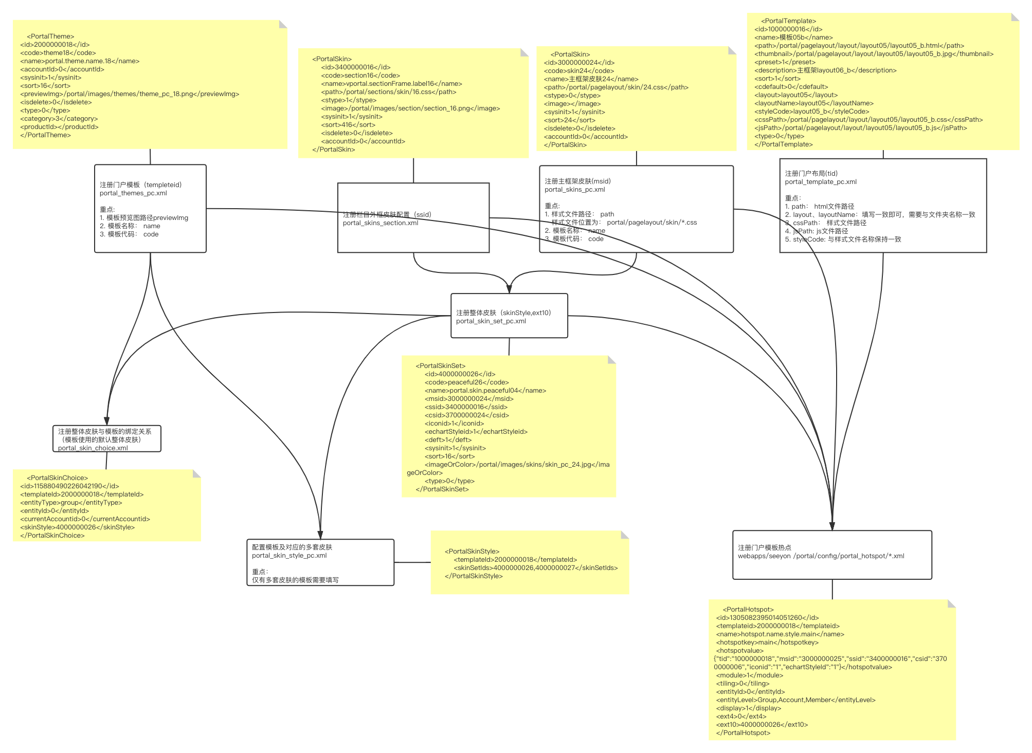 基于代码开发新模板,需要在多个xml文件中对多种模板进行注册, 各配置文件的关系图参考下图所示(黄框中为示例代码):