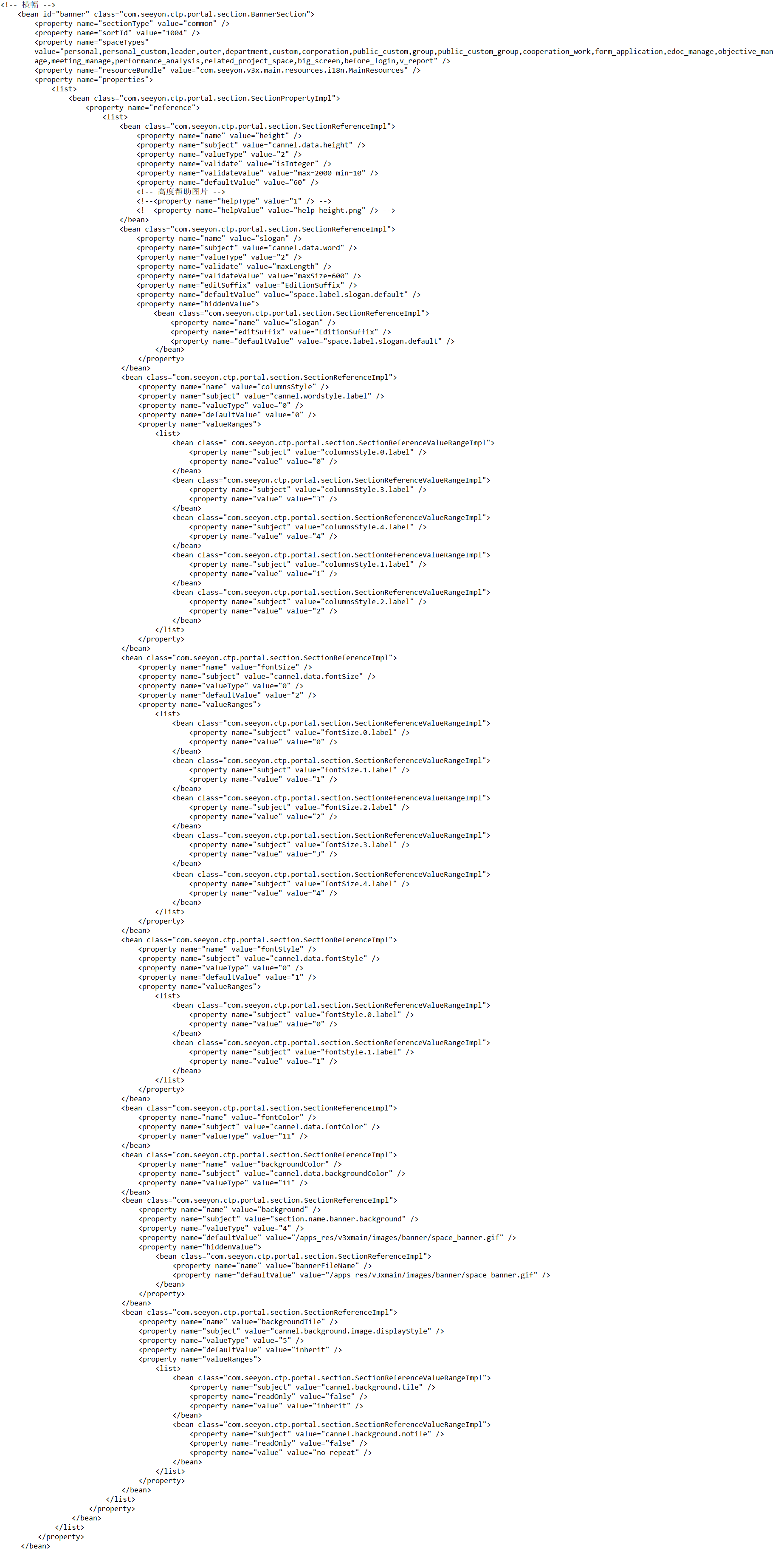 - com.seeyon.ctp.portal.section.templete.BannerTemplete 在确定了栏目要显示哪些内容后,就可以按照上面的示例内容进行栏目模板的开发。 在安装目录文件webapps/seeyon/portal/config/portal_laytpl_template/sections.xml中注册该栏目模板,添加内容如下所示: