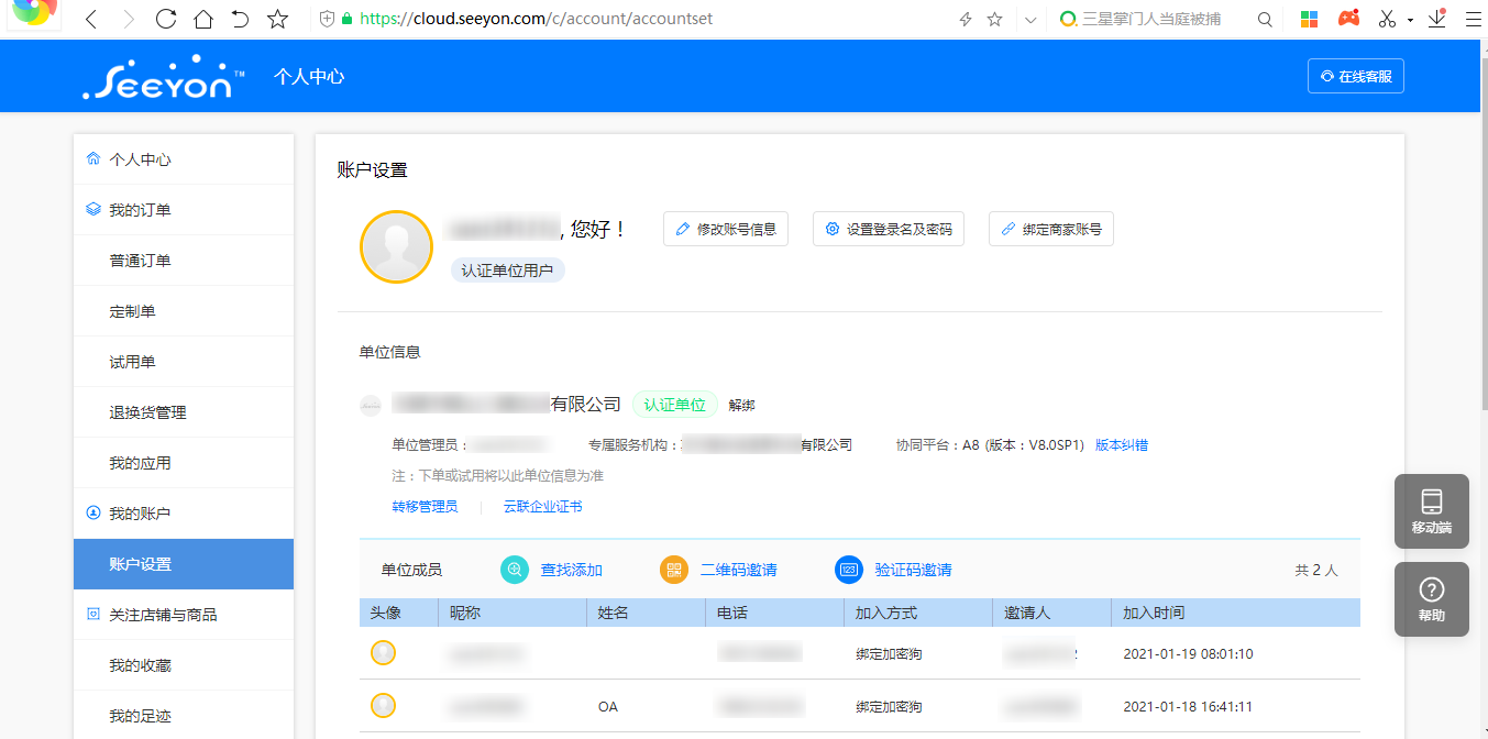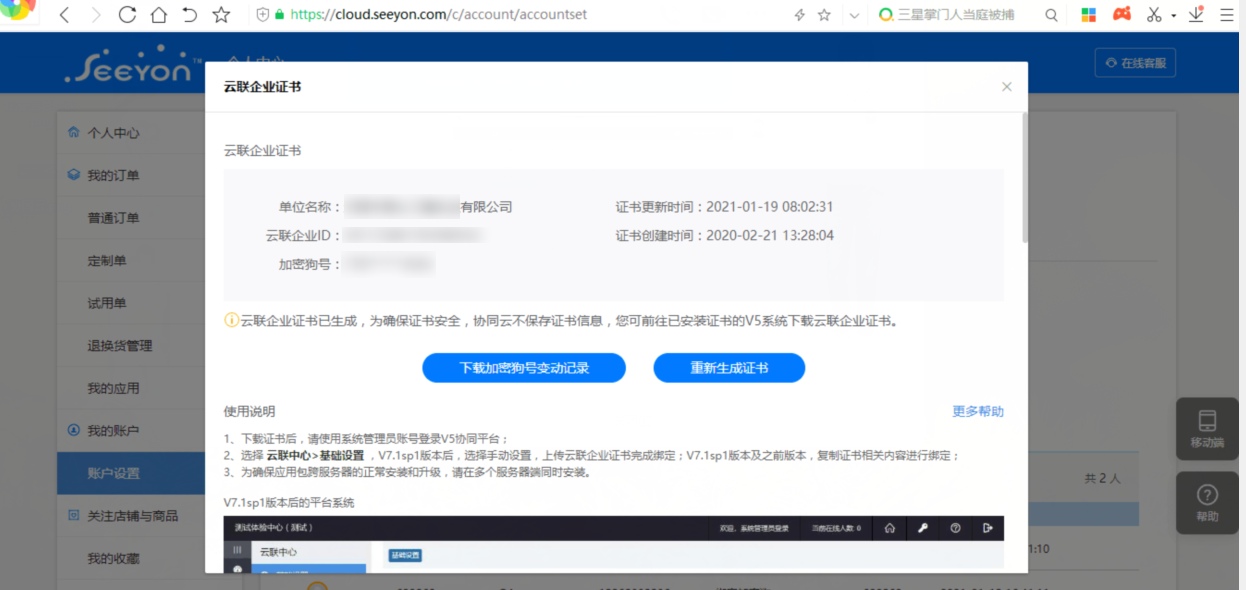 使用企业管理员账号登录cloud.seeyon.com,在账号设置中云联企业证书无法生成:
