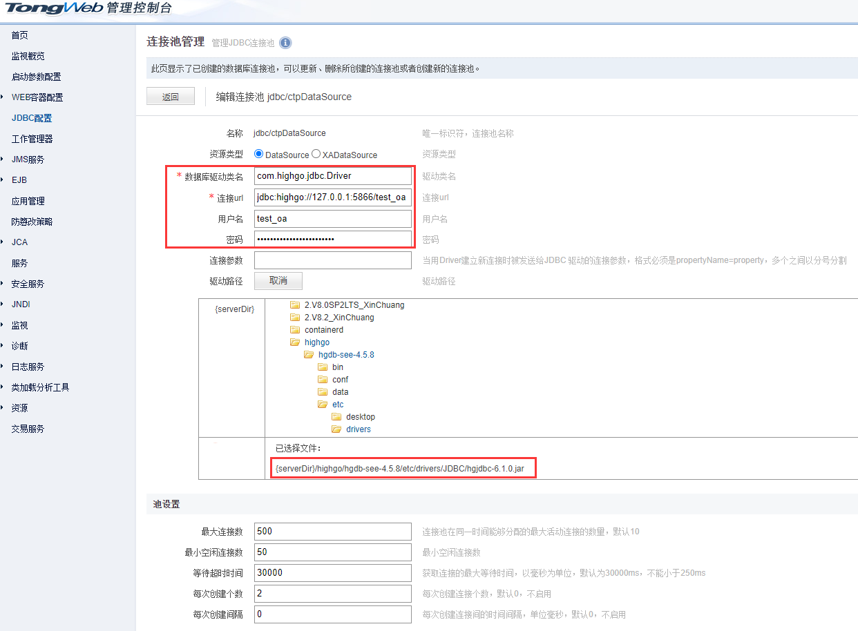 5、登录东方通中间件后台,填写瀚高相关的驱动和连接:WEB容器配置 - JDBC配置:
