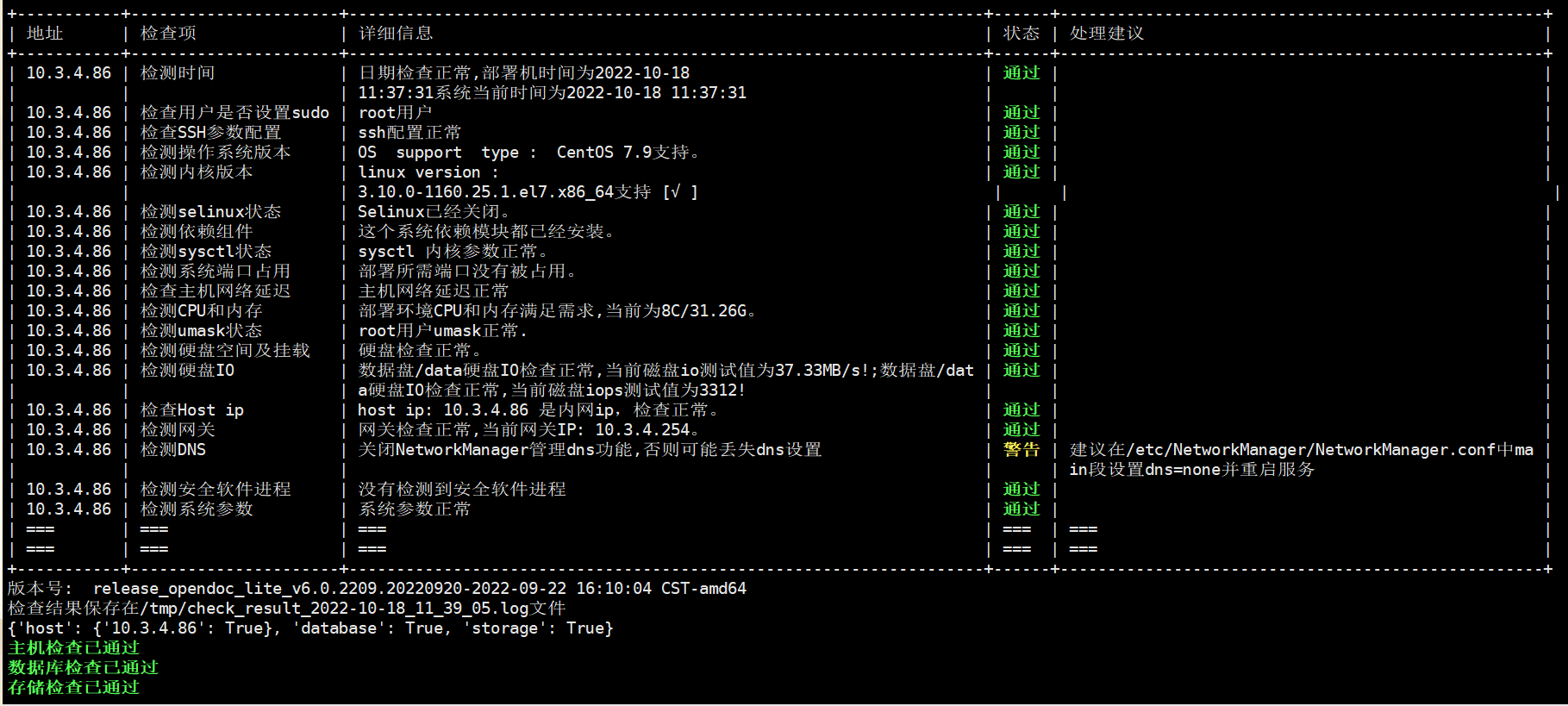所有检查项的状态都必须显示通过或者警告,当检查结果出现警告时可以按照处理建议进行修复,如果已经提前预知并且接受此风险可以继续部署,当出现不通过时禁止执行后续步骤。