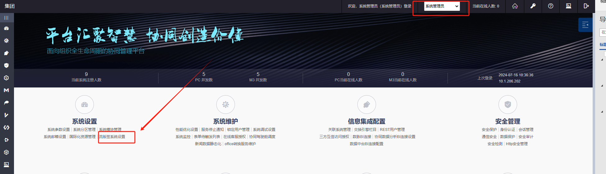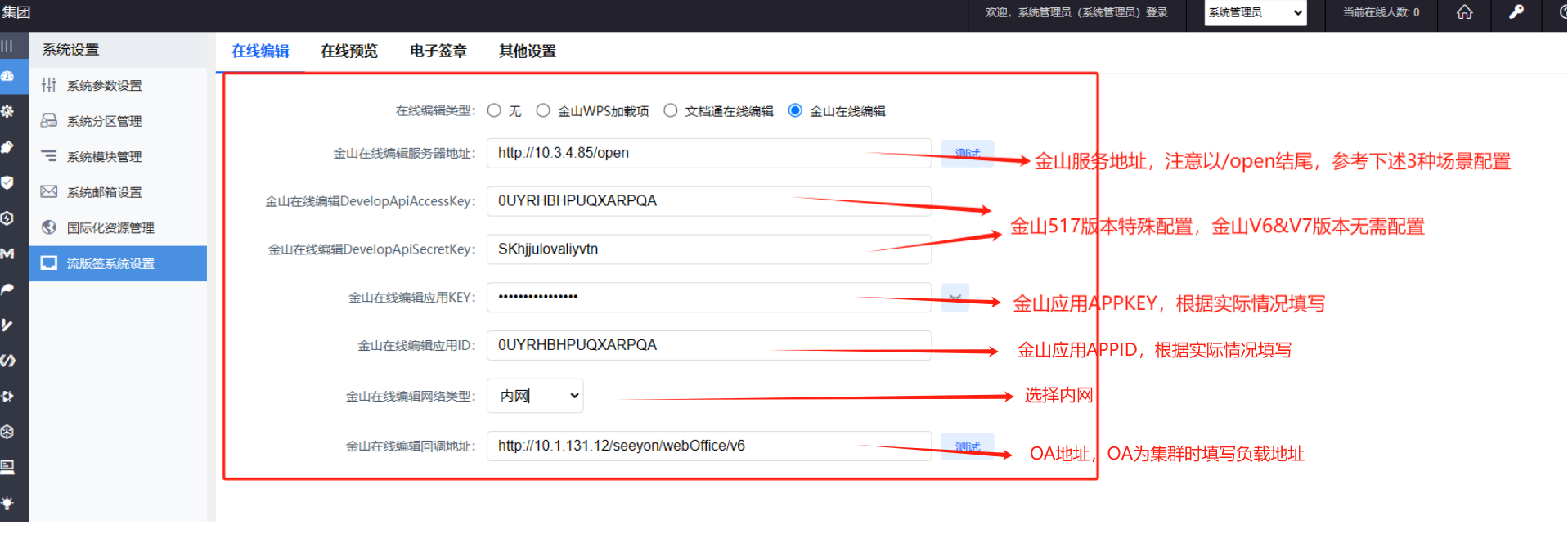 特别说明:9.0SP1及以后版本,金山与OA对接的相关配置,已不再从Seeyonconfig上配置。配置调整到了 》OA系统管理员后台》系统设置》流版签设置》进行相关配置。