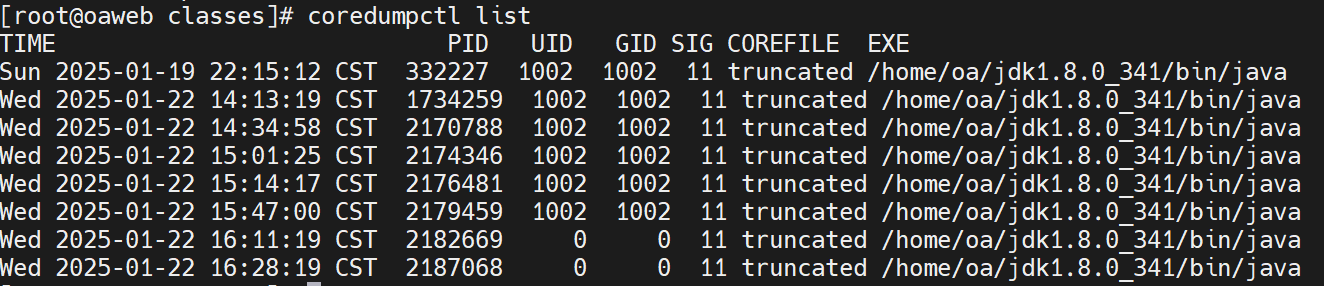 通过coredump命令能看到Java进程确实存在主动退出的问题: