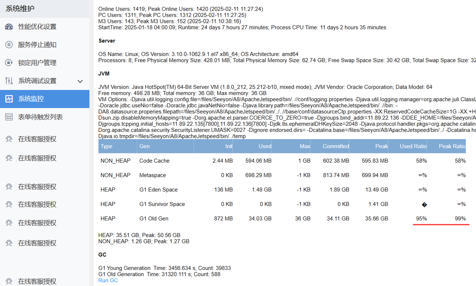 通过登录系统管理员,查看系统监控,发现JVM中的堆使用极高:历史峰值到了99%,当前使用95%。通过堆的使用率就能明确:当前系统内存占用极高,很可能存在不合理的内存申请情况。