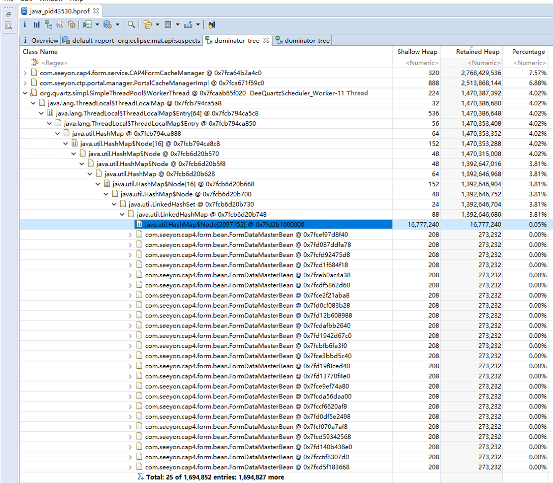 通过生成结果可以发现内存耗费点是DEE的定时任务,定时任务过多,每个定时任务都在使用大量的对象导致整体占用过高。