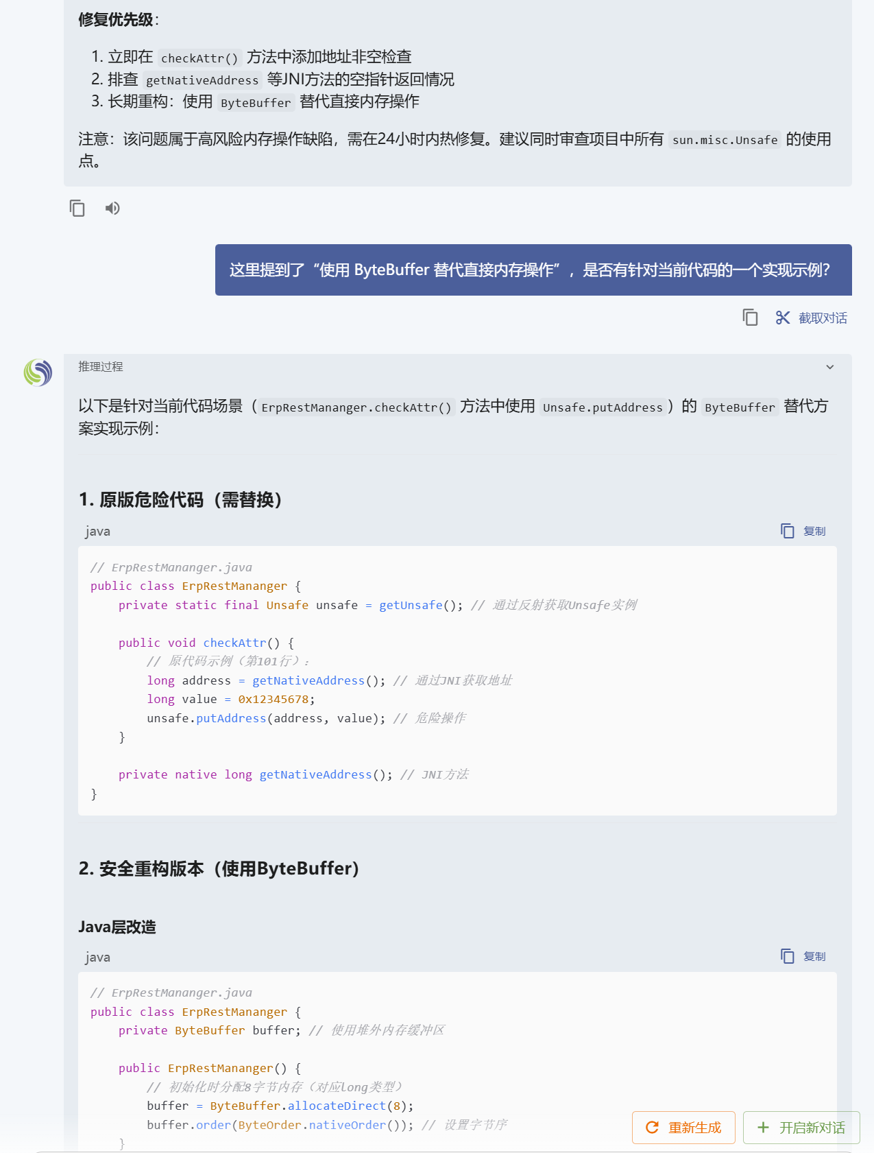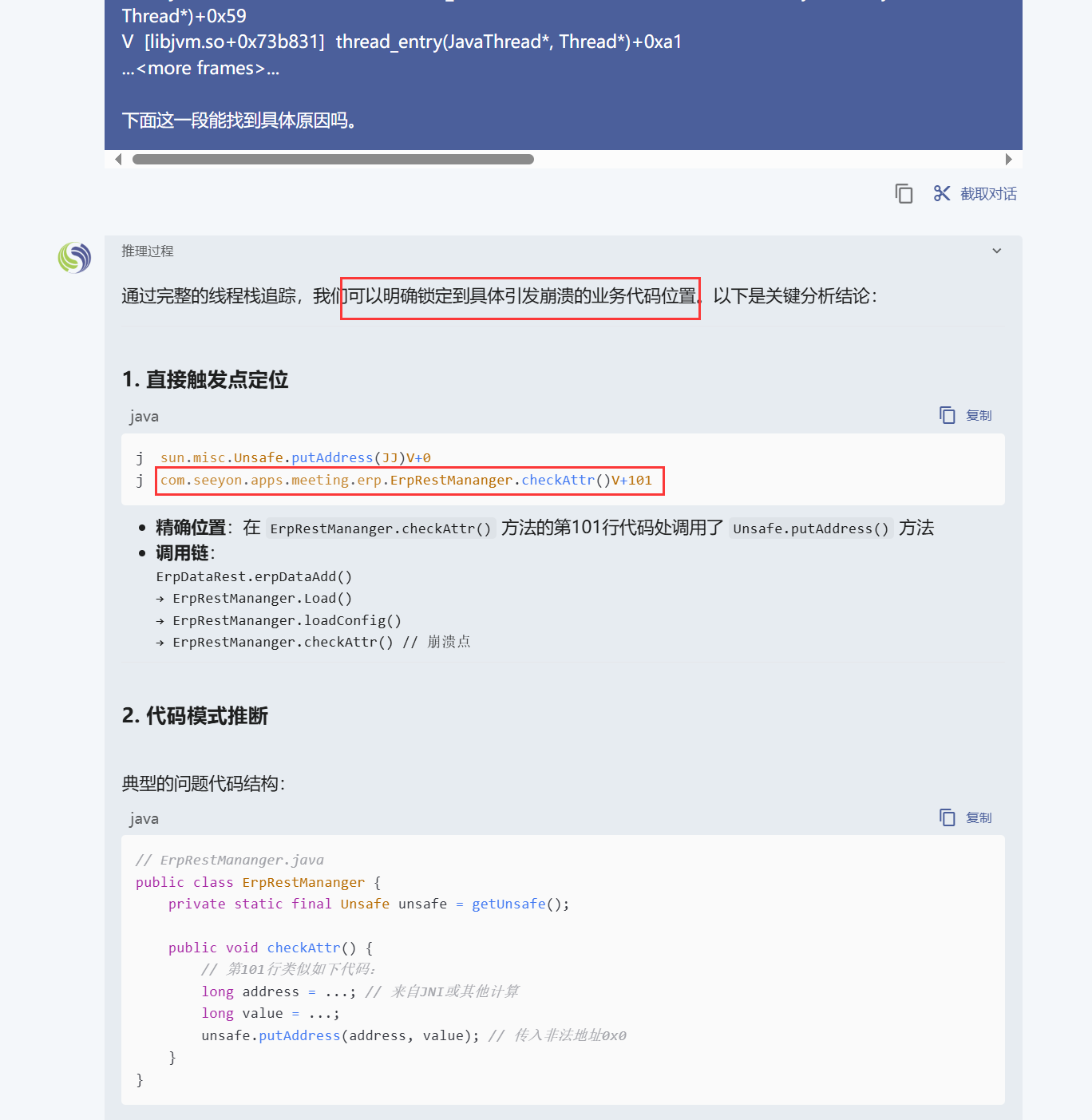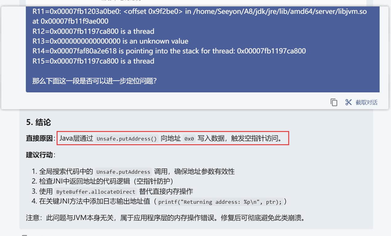 第二步,我们尝试将下一区块的内容发送给AI,得到了进一步的分析答案:AI怀疑Java层通过 Unsafe.putAddress() 向地址 0x0 写入数据,触发空指针访问。