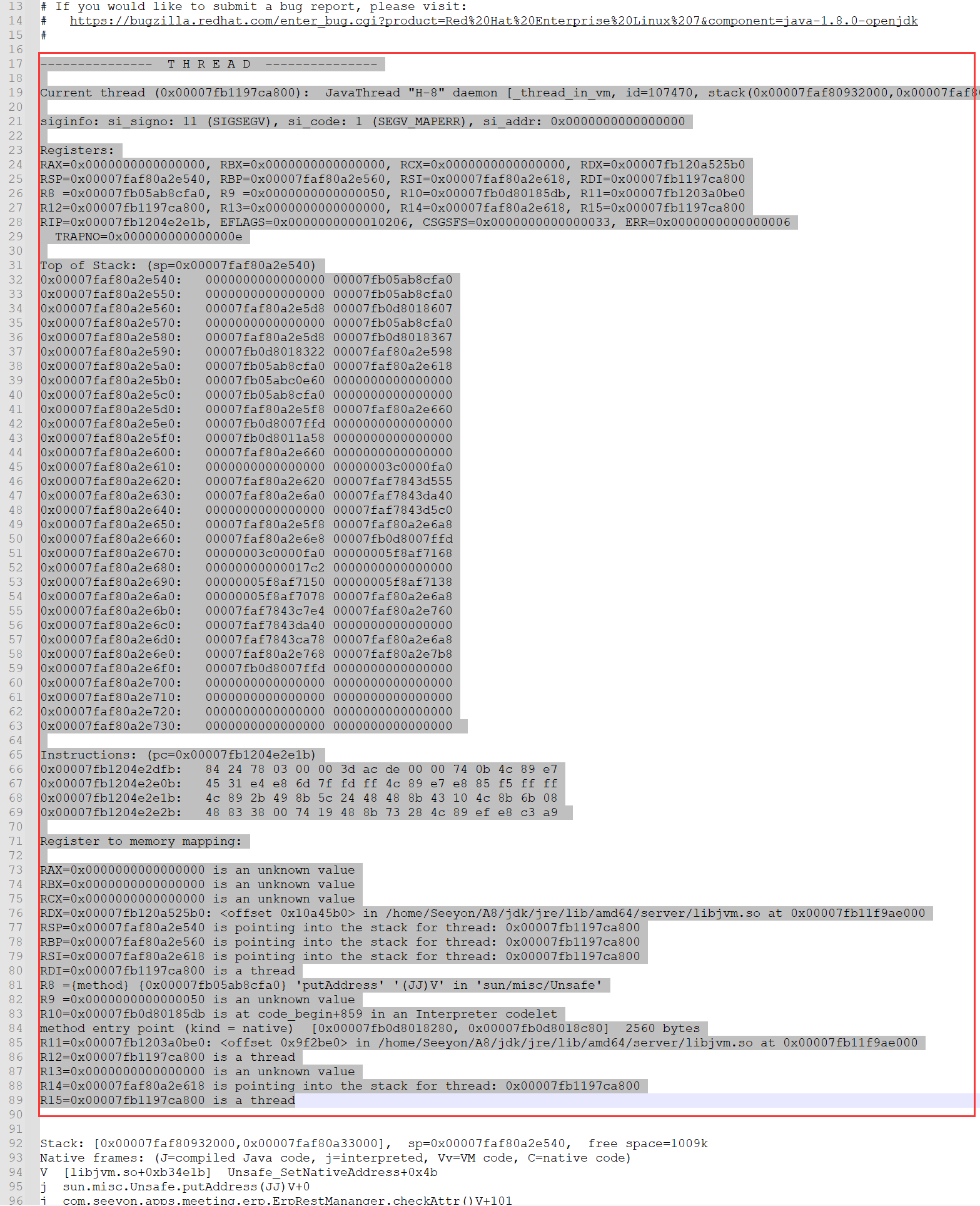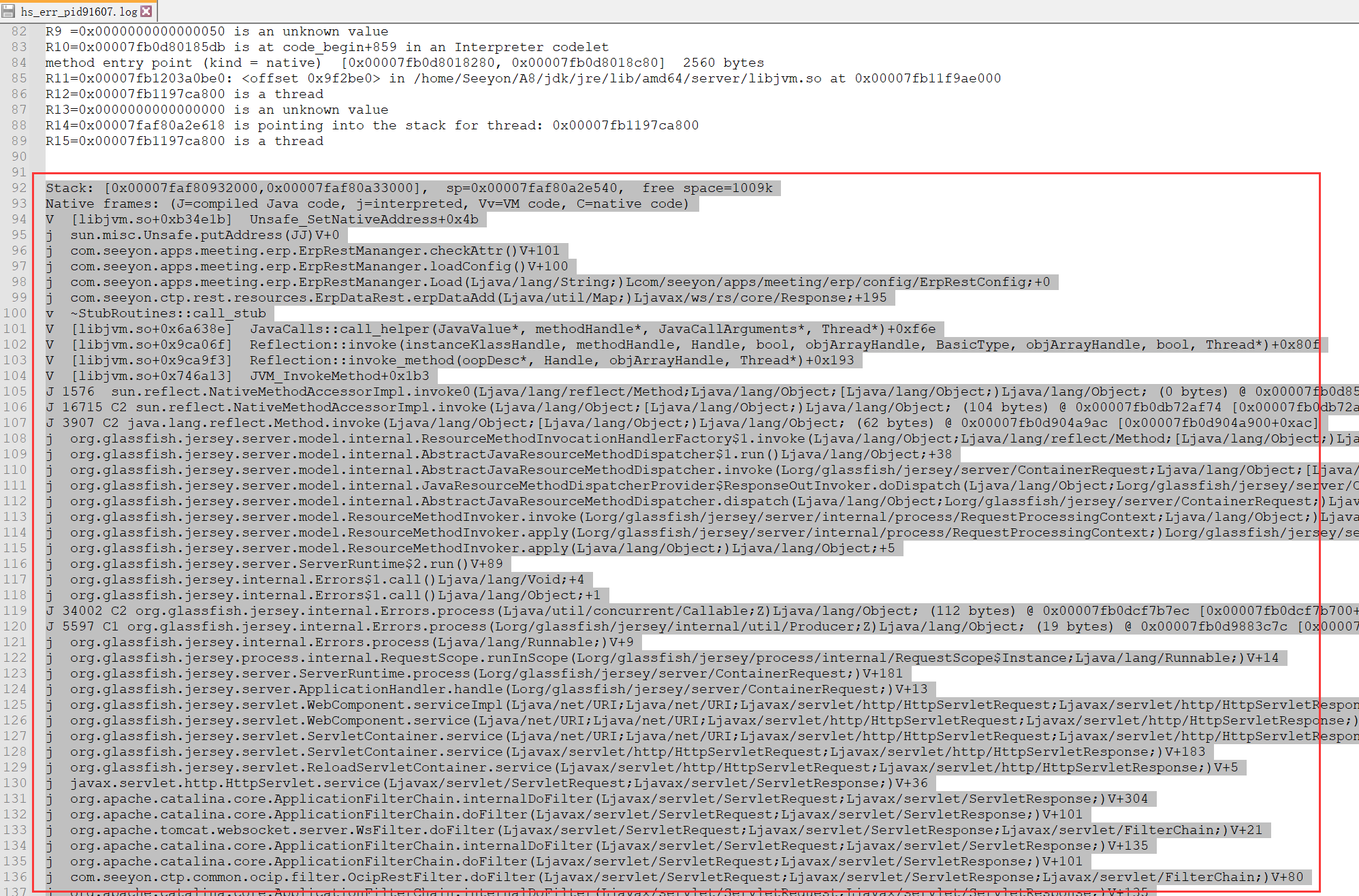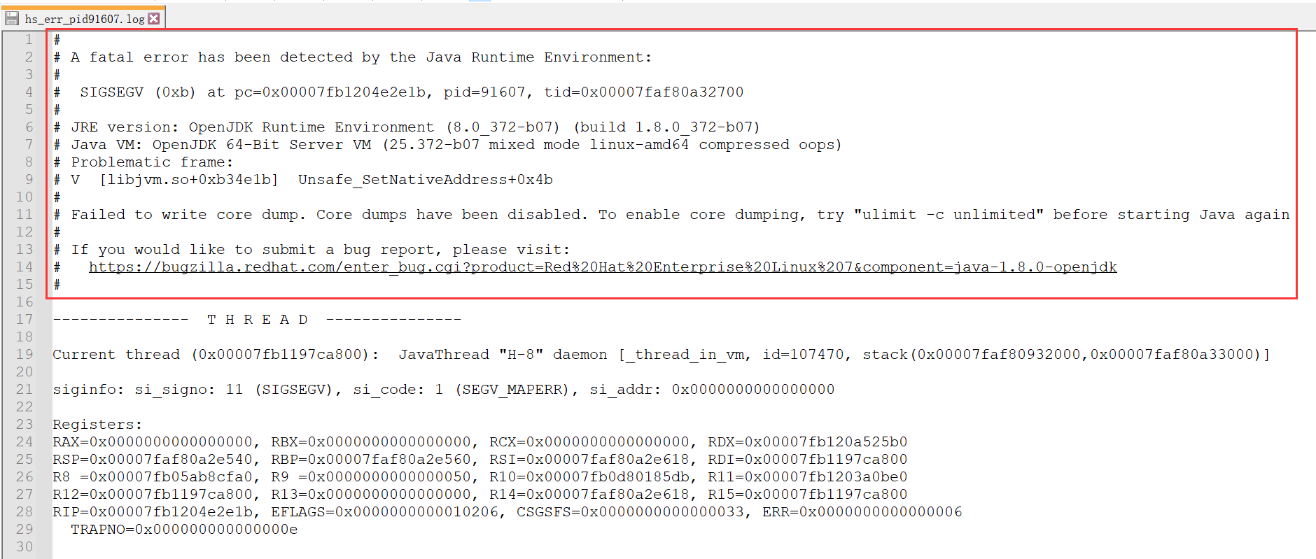 如果JVM主动退出,在标准产品的bin目录下会生成一份hs_err_pidxxxx.log的文件,本次我们也获得了崩溃的日志文件:
