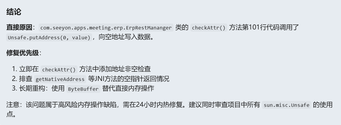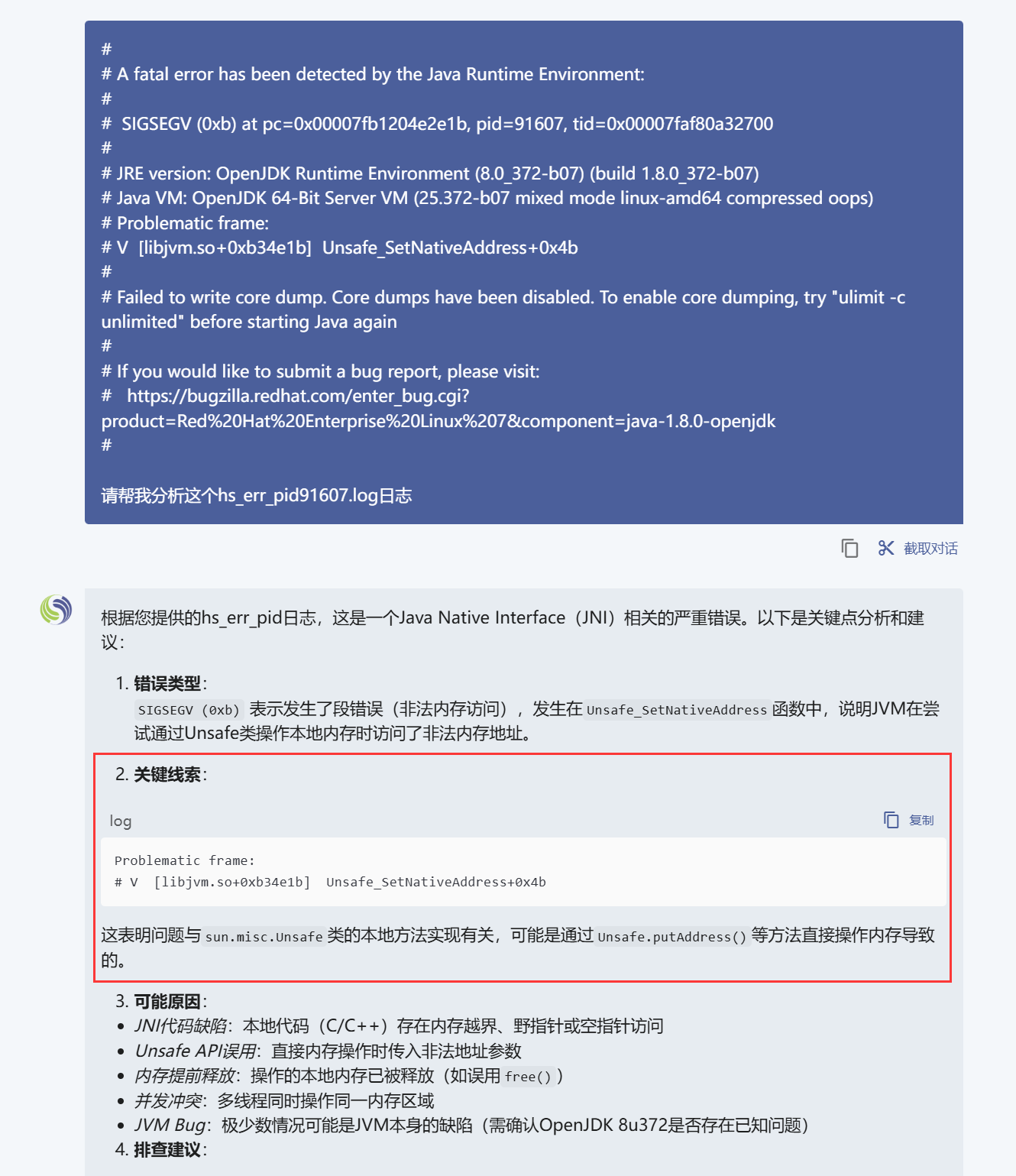 先将红框中这一区块的内容发送给AI,从AI的回复结果看,关键问题可能是:这表明问题与sun.misc.Unsafe类的本地方法实现有关,可能是通过Unsafe.putAddress()等方法直接操作内存导致的。