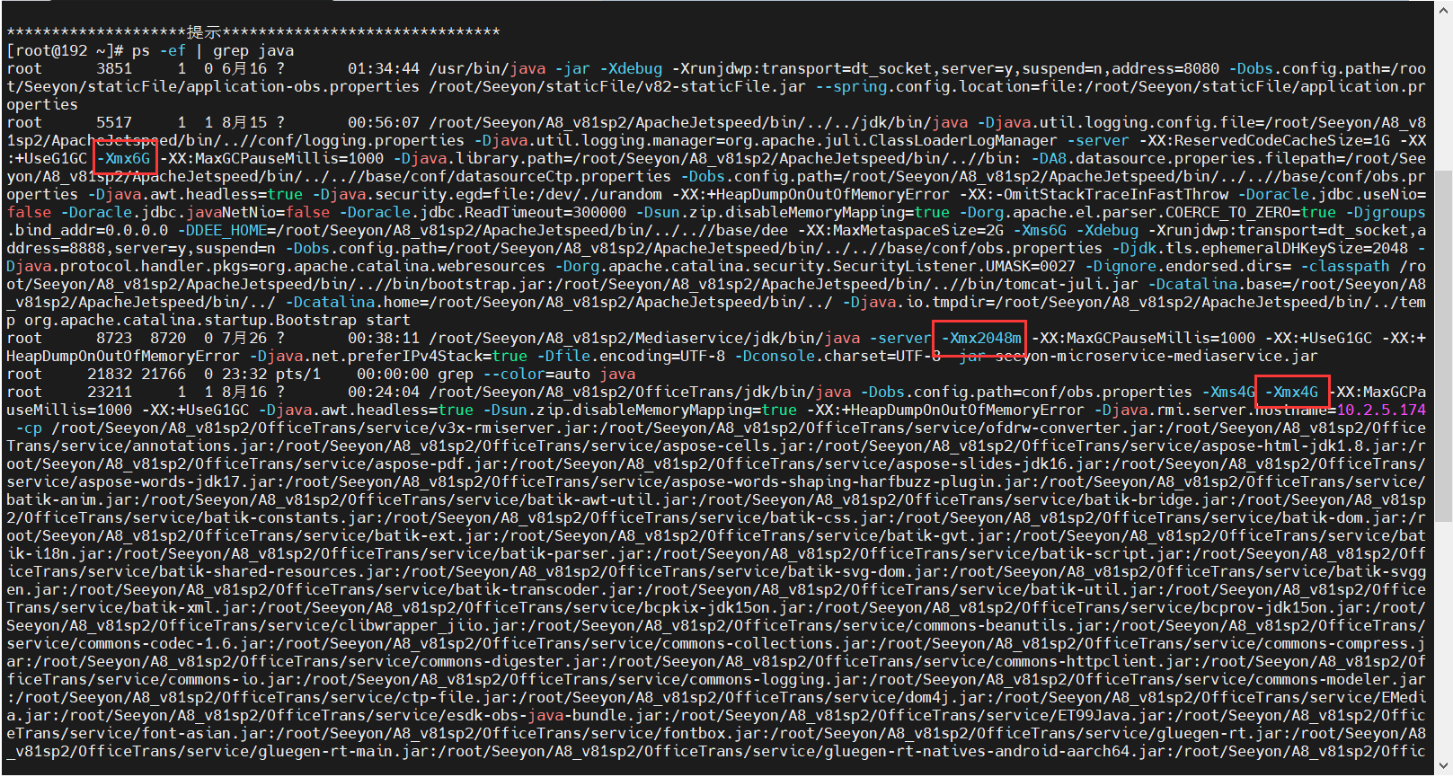 使用命令ps -ef | grep java查询已启动各项服务参数