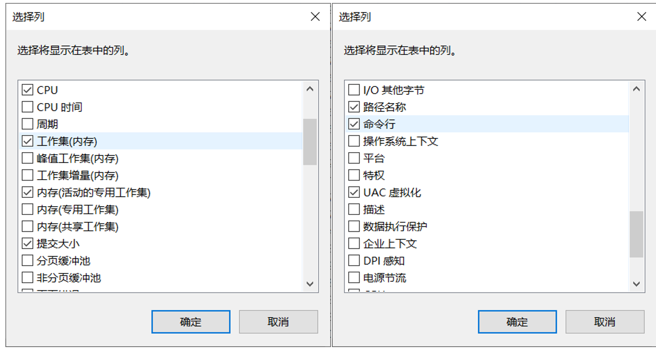 勾选工作集(内存)、提交大小、命令行