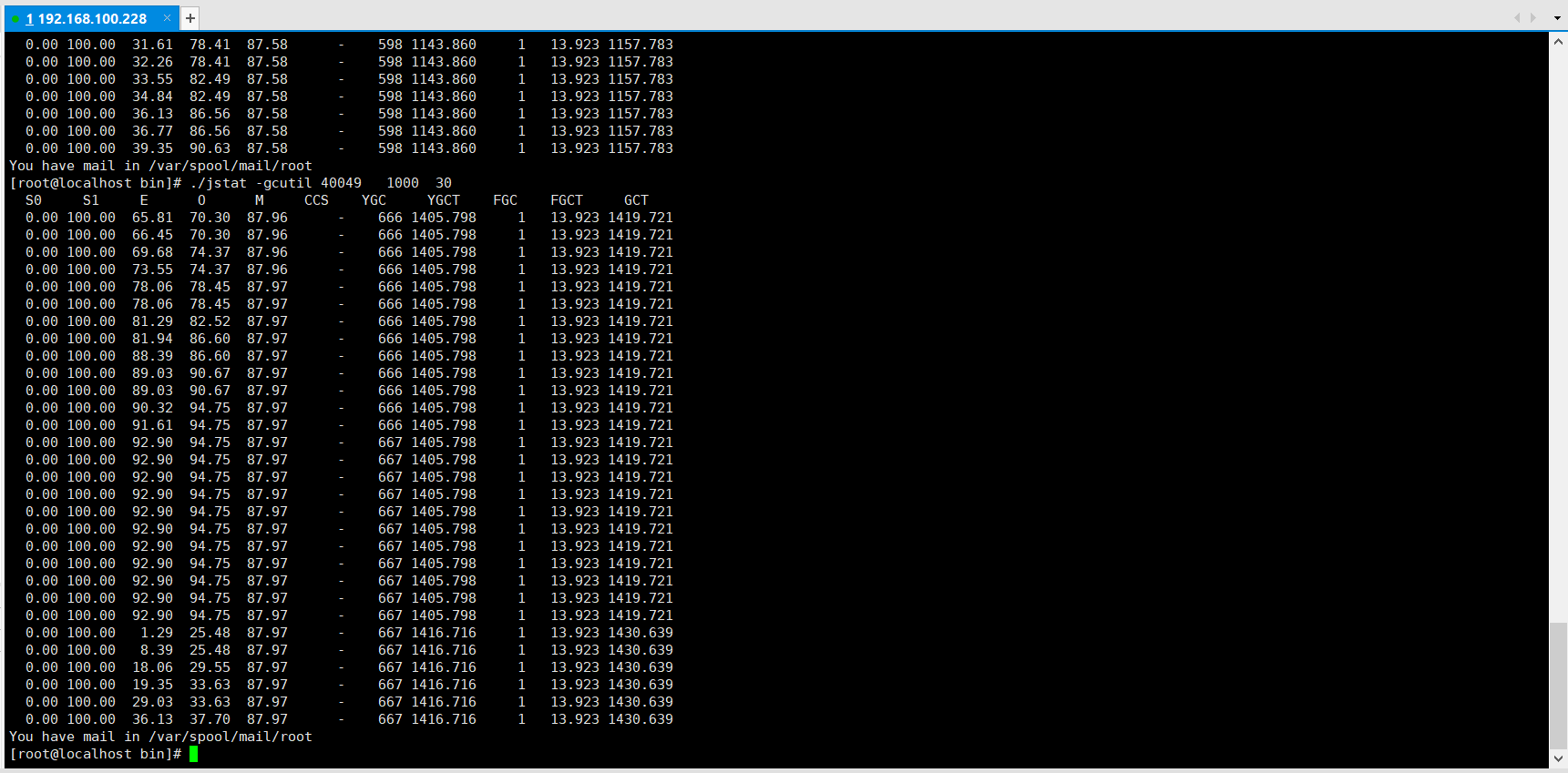 jstat命令观察内存回收同样看到年老代使用率频繁涨跌;