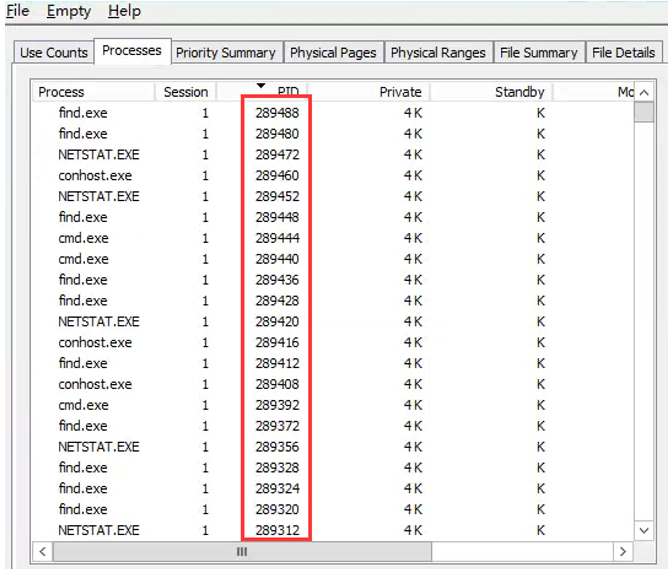 复现过程: 1、启动RAMMap.1.60\RAMMap.exe工具,选择Process,PID列降序如下图所示,pid数字大小达到10w+且包含大量netstat、find、cmd进程;点击File-Refresh刷新,可以看到pid数字大小持续增加,则存在上述内存泄露问题
