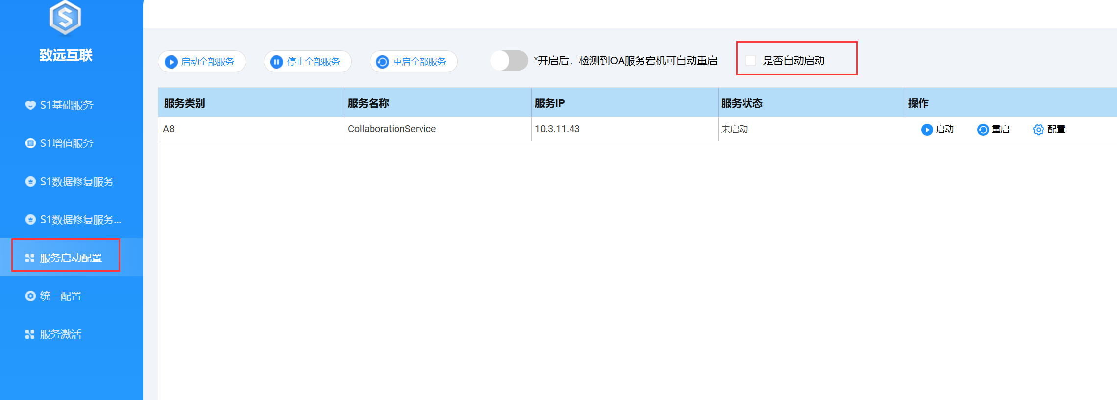 **配置:**在服务启动配置功能页面,勾选【是否自动启动】