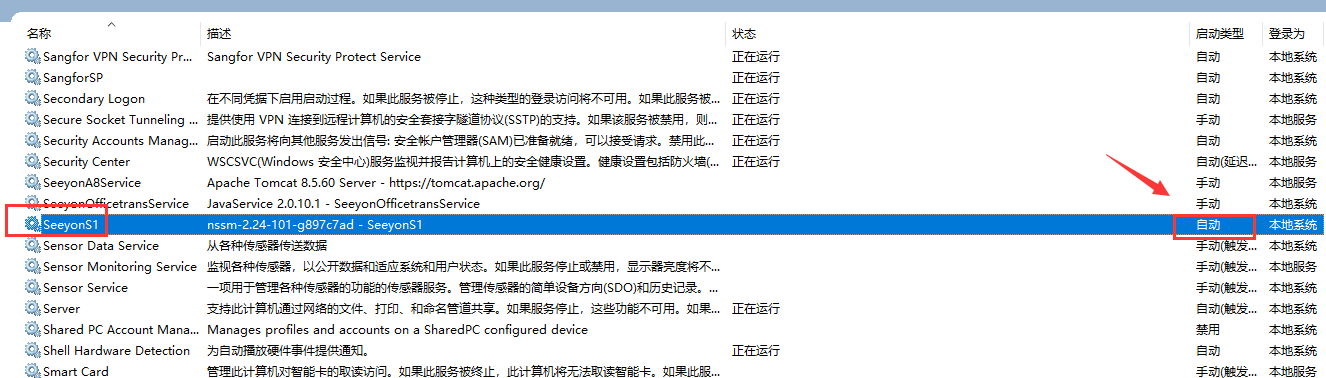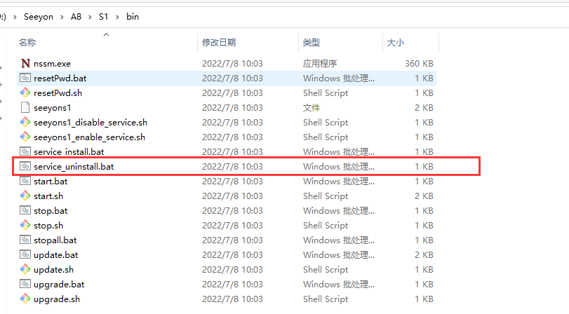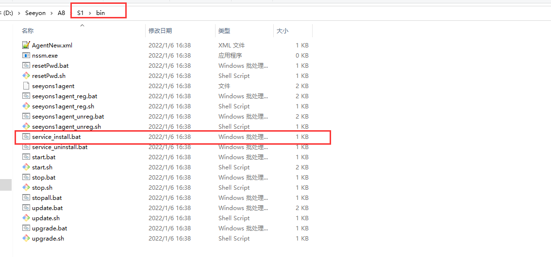 执行S1/bin/下的service_install.bat(老版本名称为nssm_install.bat,linux环境为seeyons1_enable_service.sh)进行服务注册