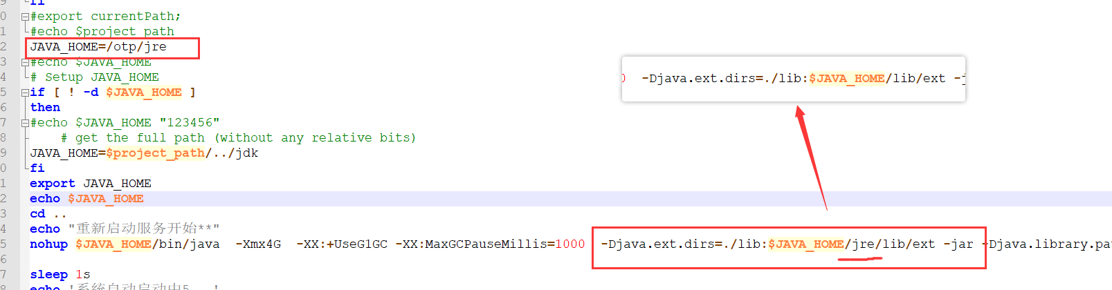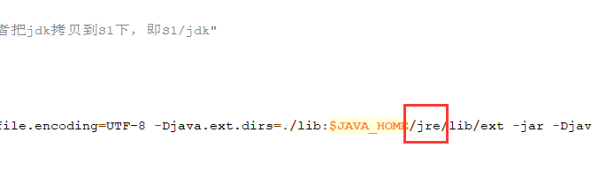 3、检查S1启动脚本中 -Djava.ext.dirs=./lib:$JAVA_HOME/jre/lib/ext 参数部分,$JAVA_HOME后面是否缺少jre,如果没有需要补上。(注意,此处和《2.1.1 信创环境JDK配置》中只有jre时,修改脚本的策略不一样,如果需要用S1打补丁包,以此处为主)