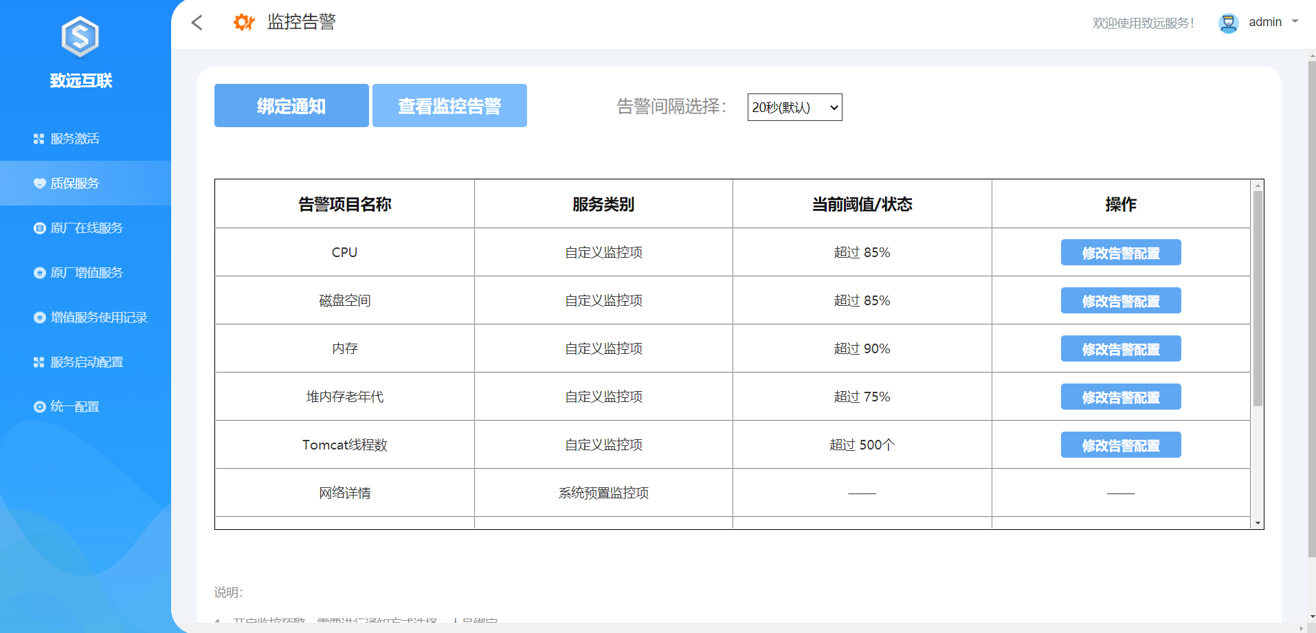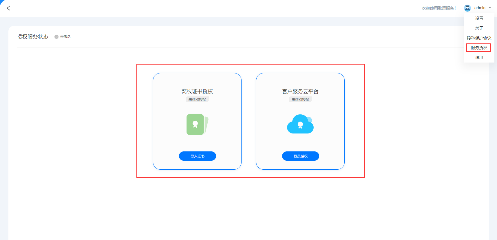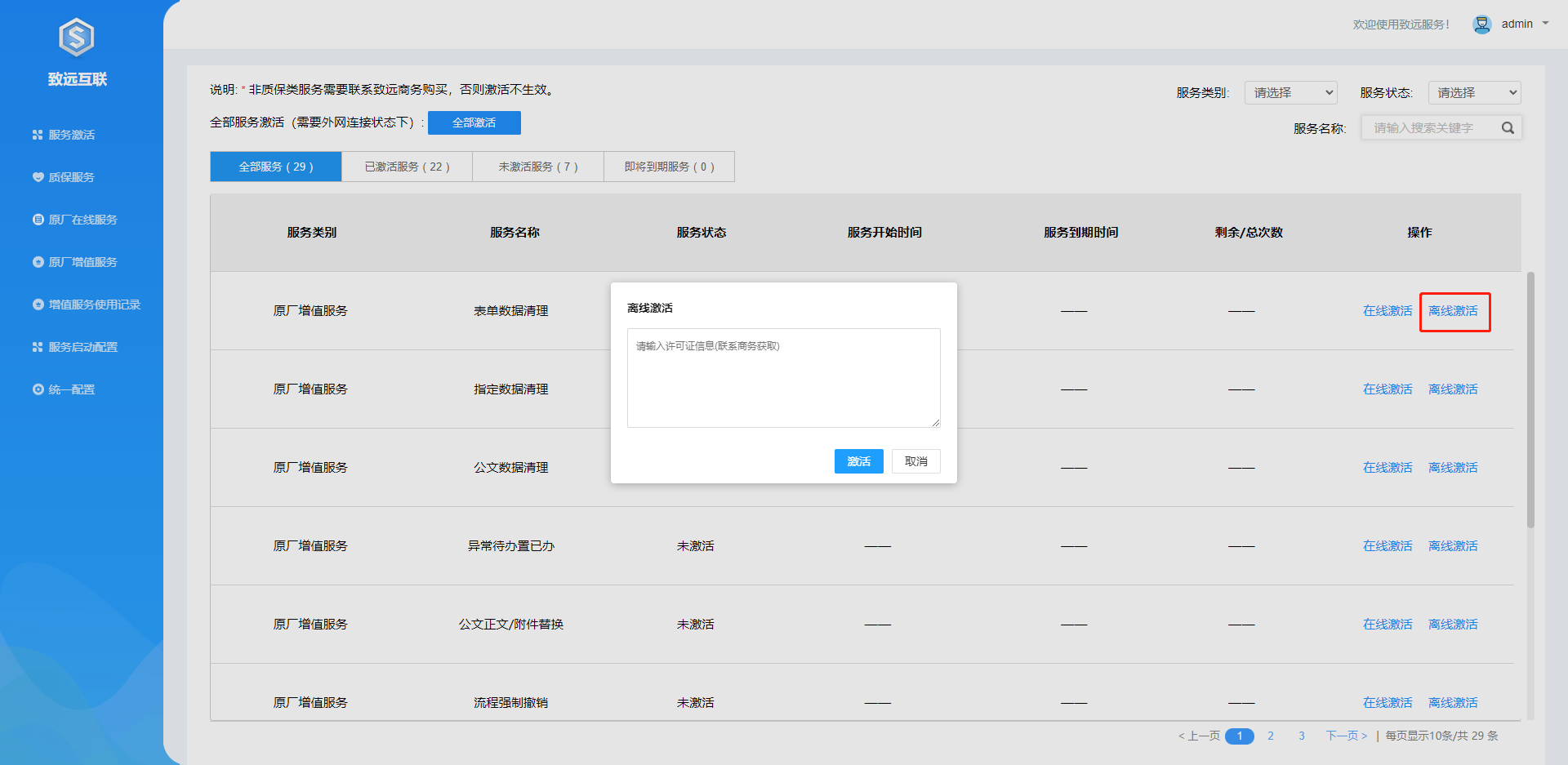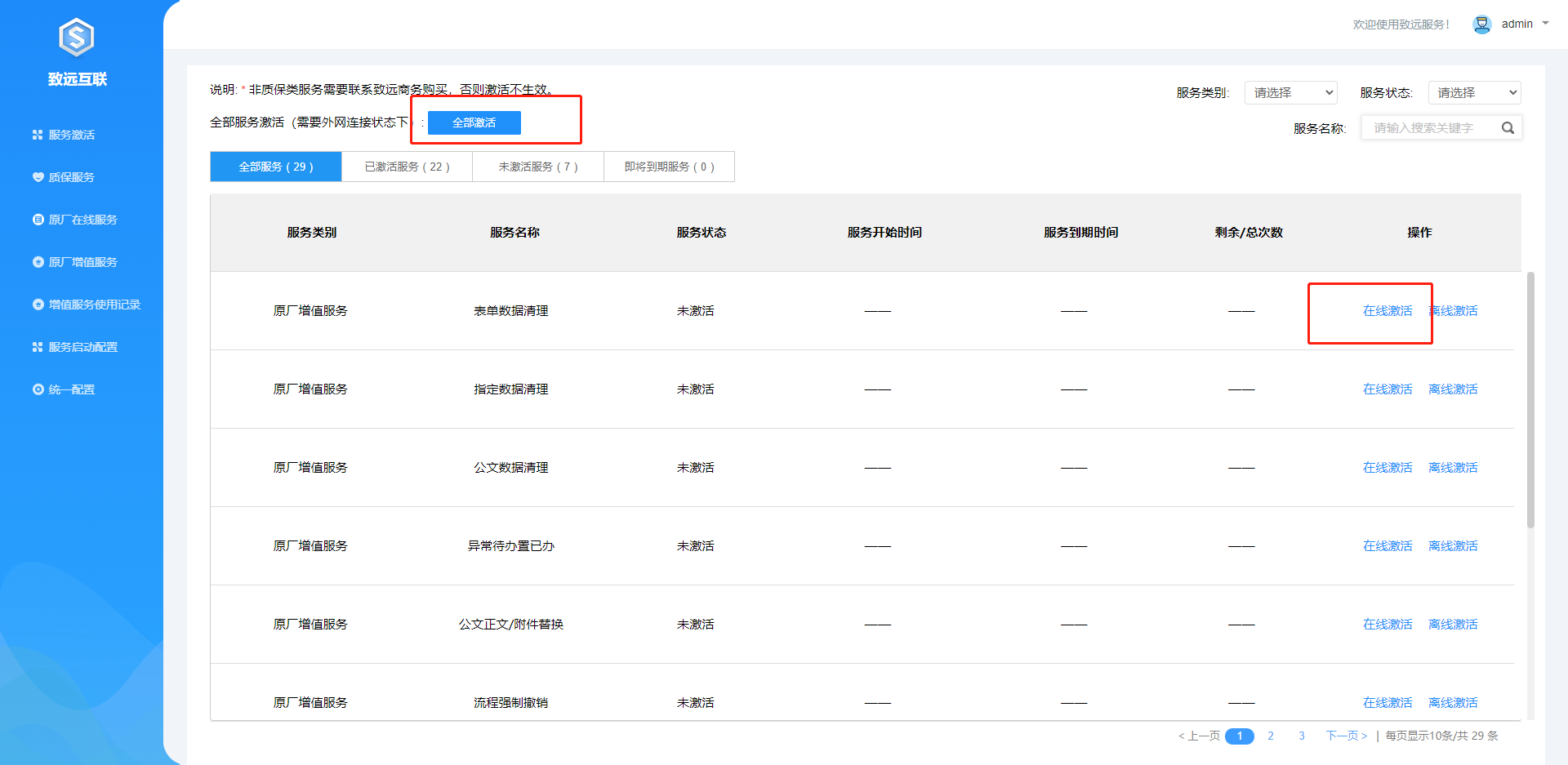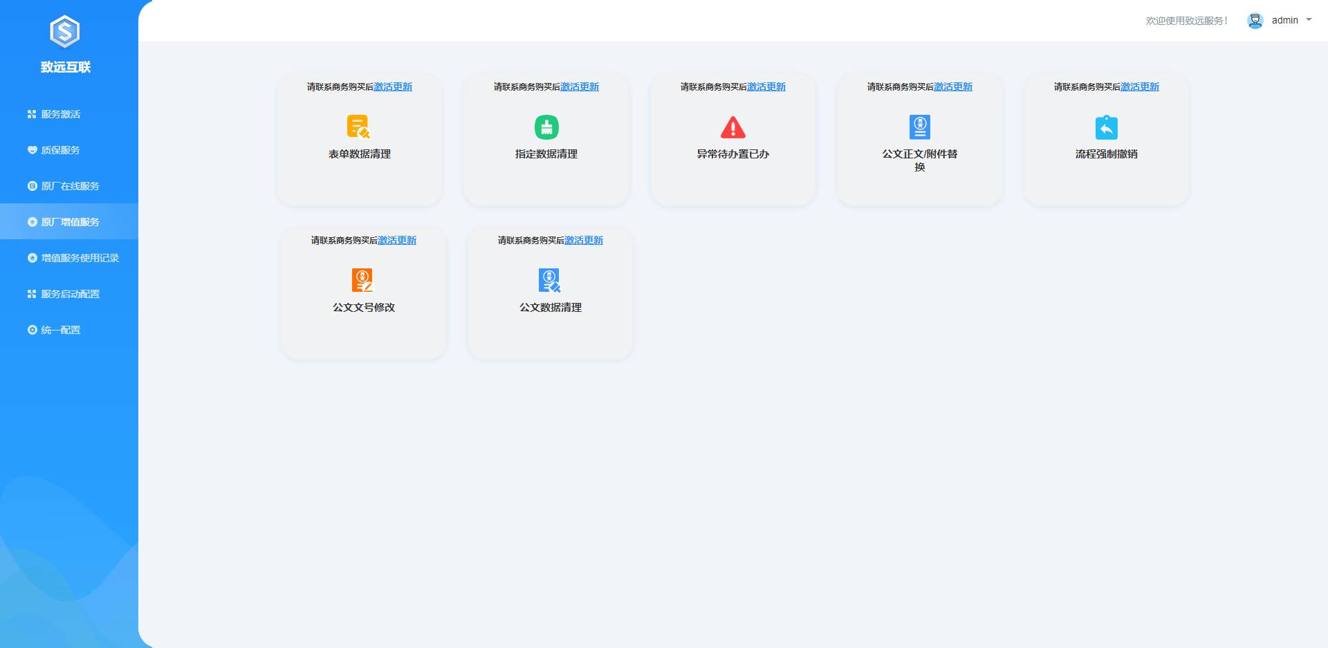 服务激活:非质保类服务需要联系致远商务购买,在此页面进行激活。